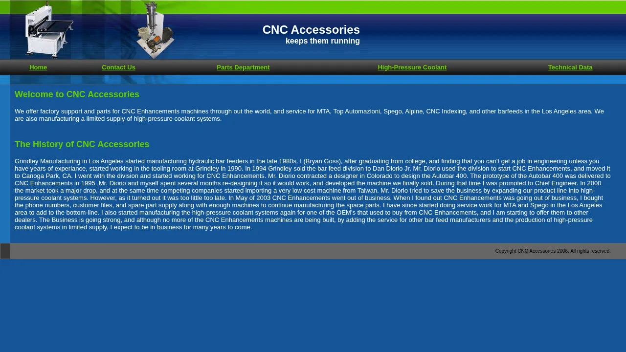 CNC Accessories provides global technical support and replacement parts for CNC Enhancements machinery. The company specializes in the manufacturing of high-pressure coolant systems and offers professional maintenance services for various bar feed systems, including MTA, Top Automazioni, Spego, and Alpine equipment. Primarily serving the Los Angeles industrial area, the business leverages deep engineering expertise to maintain legacy systems and support current manufacturing operations. They focus on delivering reliable service solutions and specialized coolant equipment to dealers and industrial clients.