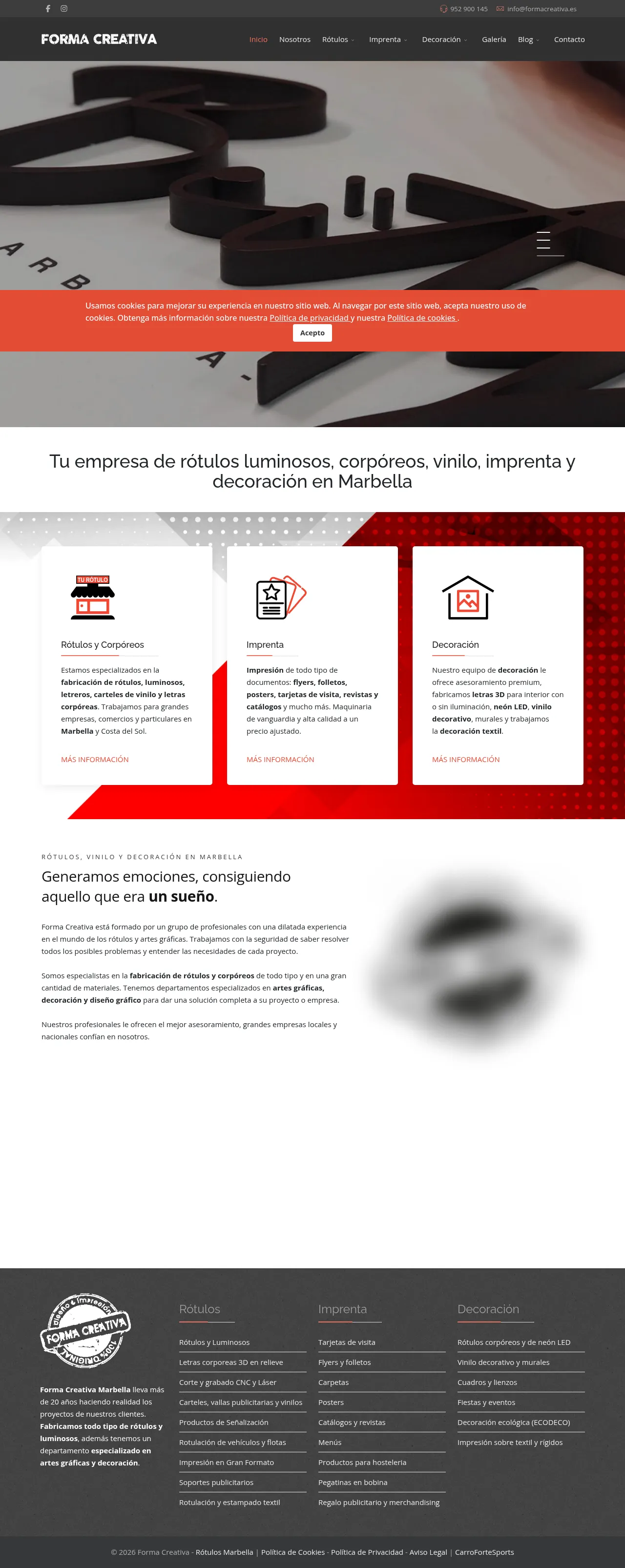 Forma Creativa is a professional graphic arts and signage company based in Marbella, specializing in the design, manufacture, and installation of advertising materials. Their core capabilities include producing custom luminous signs, 3D channel letters, large format printing, and vinyl graphics for corporate and retail environments. They also offer comprehensive printing services for stationery, marketing brochures, and event materials, alongside CNC and laser engraving solutions. By utilizing in-house production equipment and advanced design software, the company provides customized branding solutions tailored to specific client needs. The firm serves various industries, including hospitality, retail, and corporate sectors, focusing on high-quality materials and efficient project execution.