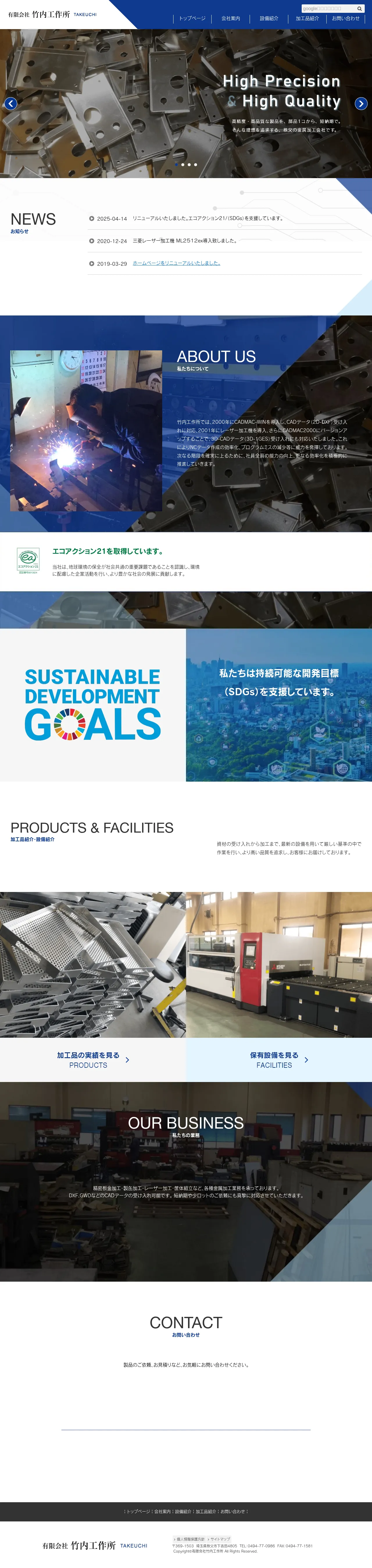 Takeuchi Kousaku is a specialized manufacturing company based in Chiba, Japan, providing comprehensive metal processing services since 1984. Their primary capabilities include precision sheet metal fabrication, plate welding, laser cutting, and housing assembly. The company leverages advanced CAD/CAM software to accept 2D and 3D data, ensuring high-efficiency programming and consistent product quality. Serving a diverse range of industrial sectors, they are equipped to handle short-run requests and urgent delivery timelines. Takeuchi Kousaku is committed to sustainable operations, maintaining certification in Eco Action 21 and supporting various environmental sustainability initiatives.