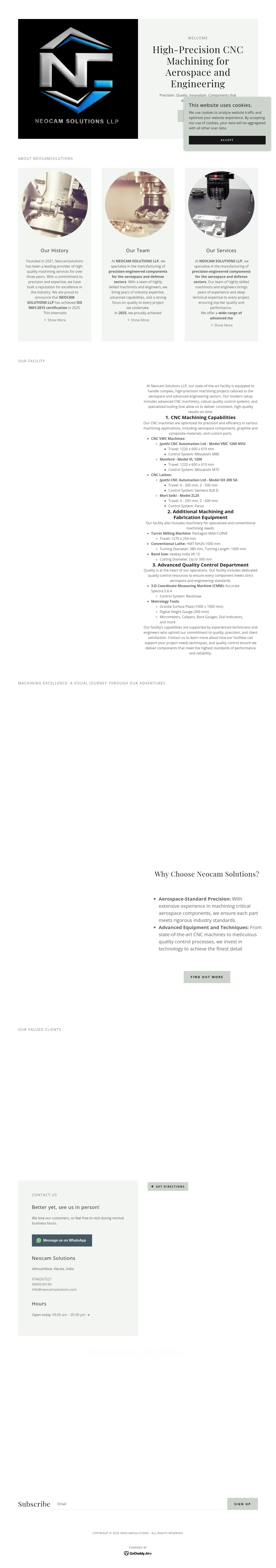 NEOCAM SOLUTIONS LLP is a precision machining company specializing in high-tolerance CNC manufacturing for aerospace, defense and advanced engineering applications. Founded in 2021, the firm operates a modern facility staffed by experienced machinists and engineers and offers milling, turning and custom precision machining services. It works with a range of high-performance materials and maintains dedicated quality-control and inspection processes to meet demanding industry requirements. The company holds ISO 9001:2015 certification.