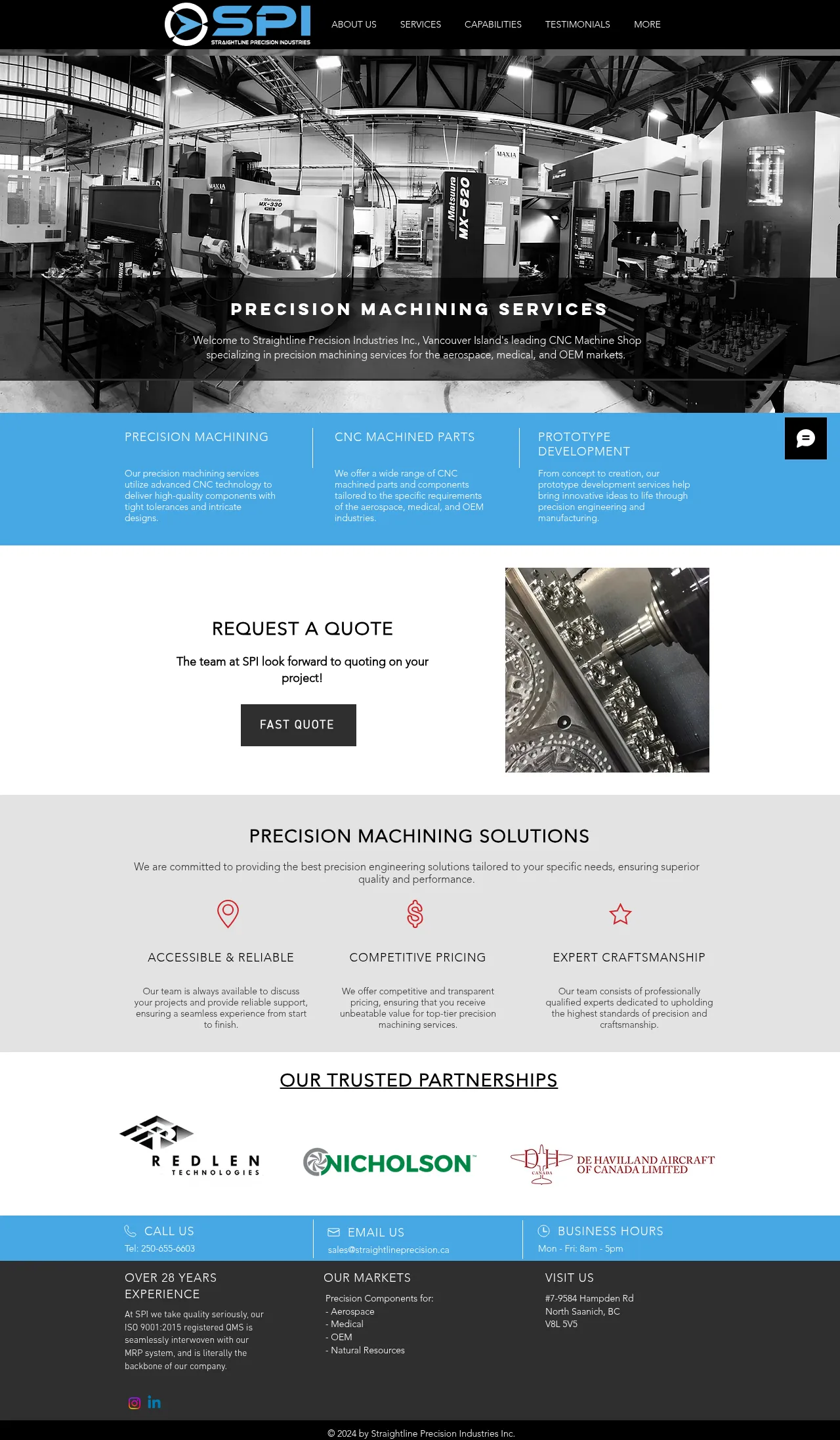 Straightline Precision is a manufacturing firm with over 28 years of experience in precision machining and engineering. The company specializes in producing high-quality CNC components for the aerospace, medical, OEM, and natural resource industries. Their services encompass prototype development and technical component manufacturing designed to meet rigorous tolerance specifications. Quality control is maintained through an ISO 9001:2015 registered management system integrated directly with their operational software. The firm provides professional engineering support from project concept through to final production delivery.
