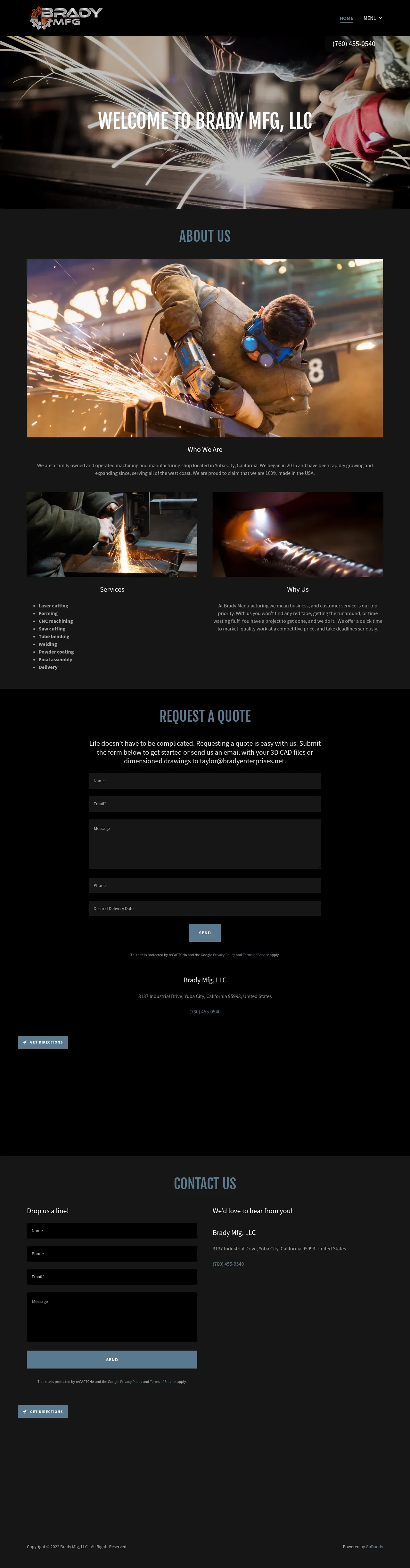 Brady Mfg, LLC is a family-owned machining and manufacturing facility based in Yuba City, California. Established in 2015, the company provides comprehensive metal fabrication and assembly services to clients throughout the West Coast. Their production capabilities span from laser cutting and CNC machining to welding and powder coating. All manufacturing processes are performed domestically, emphasizing a commitment to US-made quality. The firm focuses on quick market delivery and maintains competitive pricing for custom projects.