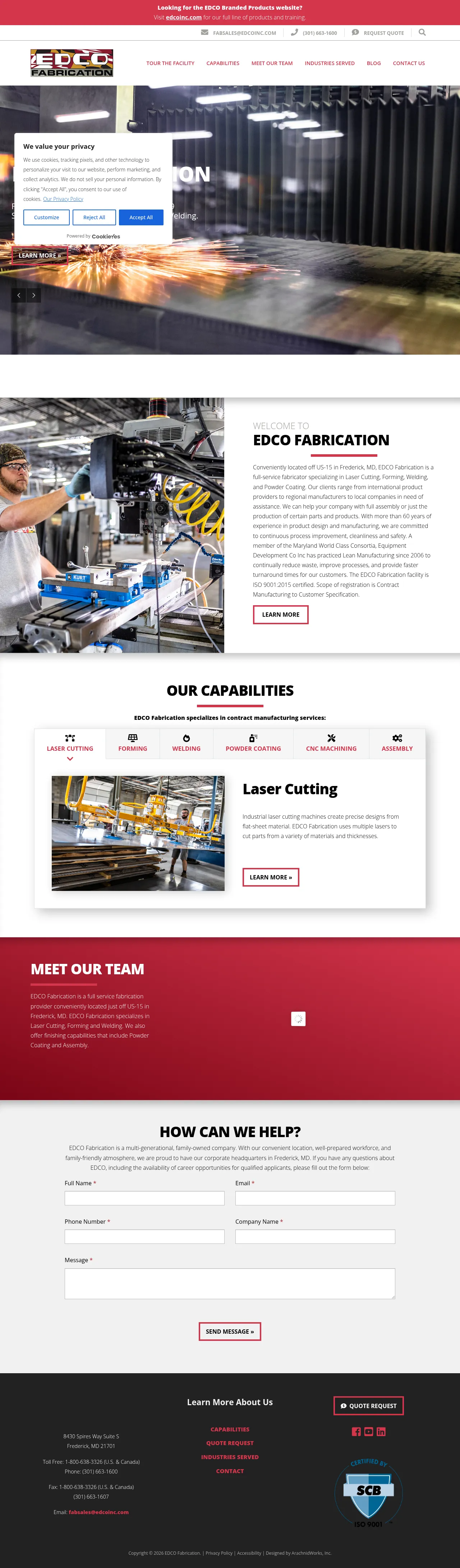 EDCO Fabrication is a full-service contract manufacturer based in Frederick, Maryland, providing industrial fabrication solutions since 1959. The company specializes in laser cutting, precision metal forming, welding, and powder coating, alongside comprehensive assembly services. Serving a diverse range of clients from international product providers to regional manufacturers, they utilize Lean Manufacturing processes to optimize efficiency and reduce turnaround times. The facility operates as a family-owned business committed to continuous process improvement, high-quality standards, and consistent craftsmanship. Their team maintains a focus on precision production and responsive customer service for projects of varying scale.
