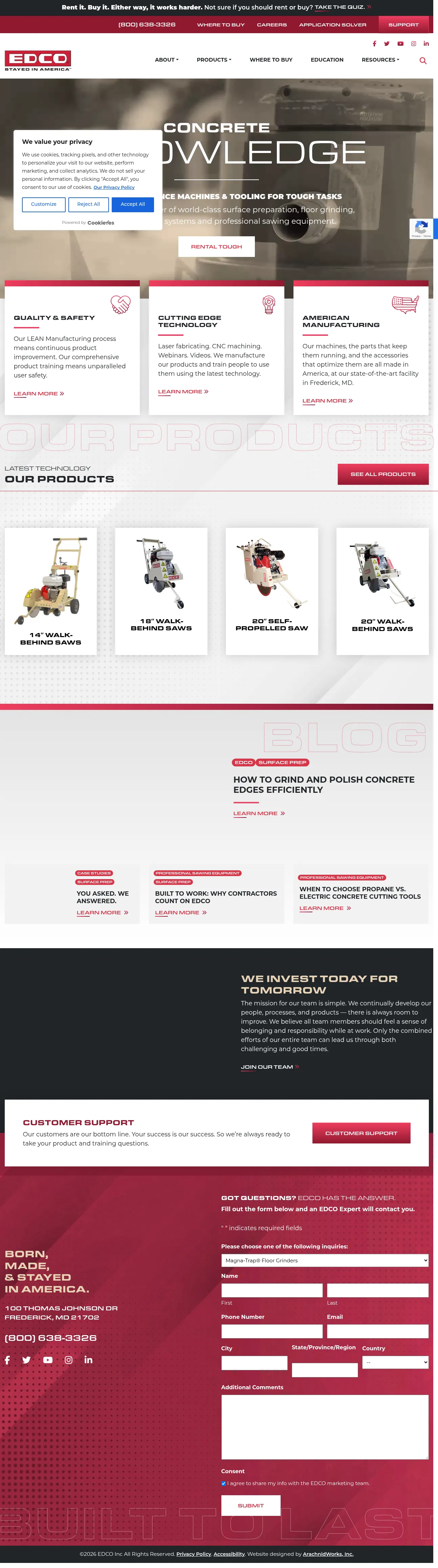 Equipment Development Company, Inc. (EDCO) is a manufacturer specializing in surface preparation, floor grinding, removal, vacuum systems, and professional sawing equipment. Founded in 1959 and headquartered in Frederick, Maryland, the company produces its entire product line in the United States using LEAN manufacturing processes. EDCO serves the construction and flooring industries, emphasizing operator safety, long-lasting product durability, and comprehensive user training. The company utilizes advanced manufacturing technologies, including laser fabrication, powder coating, and CNC machining, to support continuous product improvement.