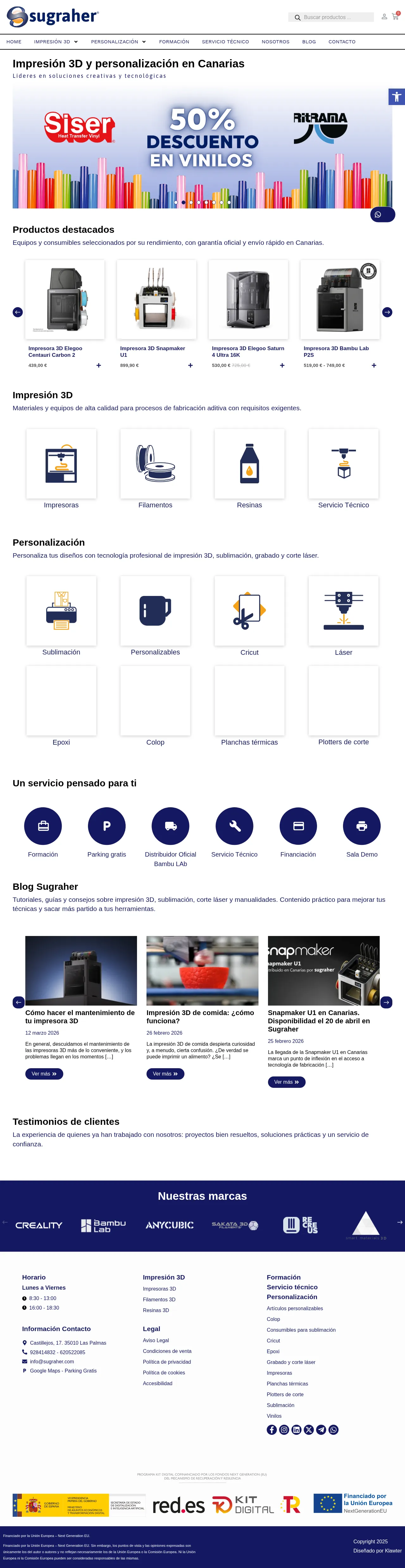 Sugraher is a Canary Islands–based supplier and service provider focused on 3D printing, sublimation, laser cutting/engraving and crafting equipment. The company is the exclusive distributor of Bambu Lab 3D printers in the Canary Islands and provides sales, technical support, training and logistics. Sugraher maintains a demo room for product evaluation and offers after-sales service and consumables with official warranties.