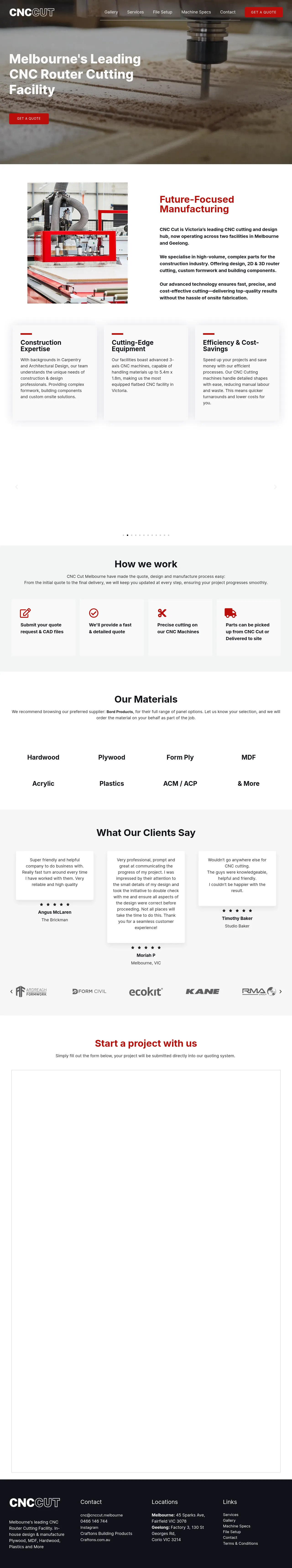 A Melbourne-based CNC router cutting facility that provides flatbed sheet cutting for industrial and fabrication projects. The company operates 3-axis CNC machines with a maximum working area of 5.4 m x 1.8 m, enabling large-format cutting and routing. It focuses on precision CNC routing and flatbed cutting services for a range of applications.