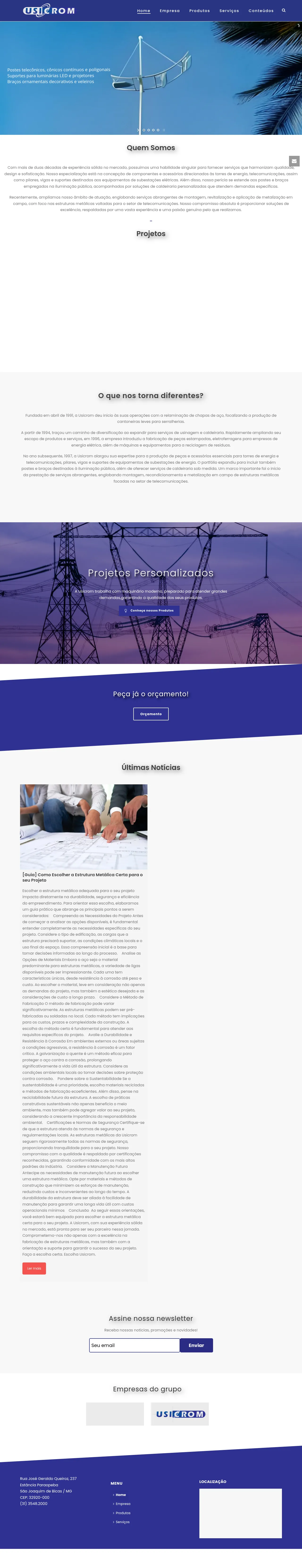 Founded in 1991, Usicrom is a Brazilian manufacturing firm specializing in metalworking, heavy steel fabrication, and structural engineering. The company provides a broad range of products, including telecommunication towers, public lighting systems, and structural components for electrical substations. In addition to custom fabrication, they offer specialized field services such as assembly, site revitalization, and structural metalization. They serve diverse sectors including energy, telecommunications, solar energy, and urban infrastructure. With decades of operational experience, the company integrates modern machinery with precision manufacturing to deliver both standardized and custom structural solutions.