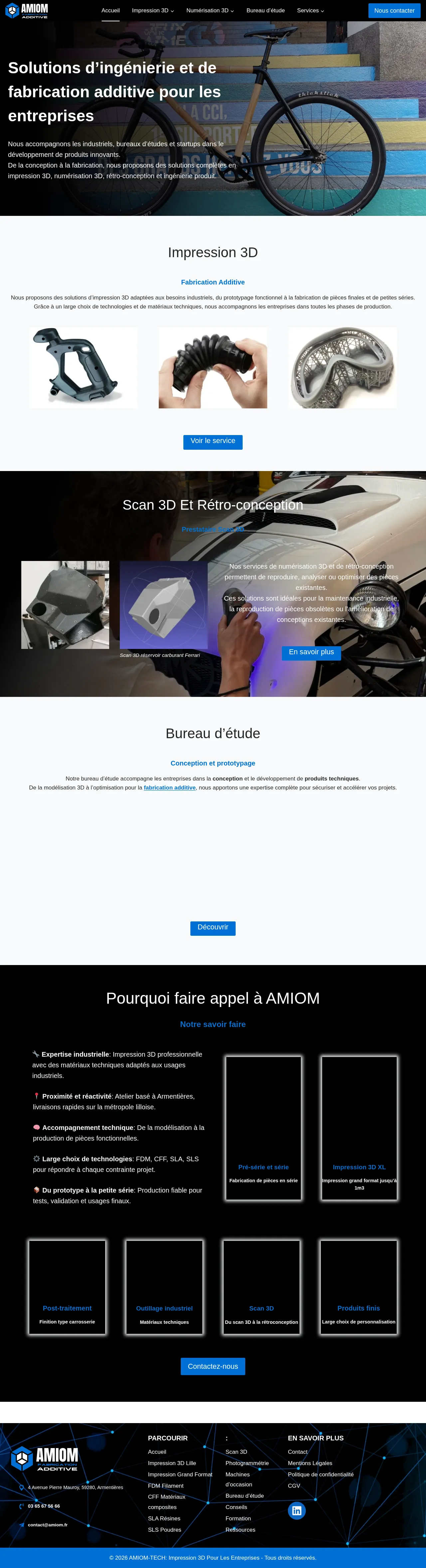 AMIOM is a French engineering and additive manufacturing service provider based in Armentières, specializing in industrial 3D printing solutions. The company supports industrial firms, research departments, and startups throughout the product development cycle, from initial design and 3D modeling to final production. Key capabilities include 3D scanning, reverse engineering, and professional additive manufacturing for prototypes, pre-series, and small-batch production. AMIOM offers high-quality post-processing and industrial tooling services, catering to maintenance, part optimization, and innovative product realization. Their facility is equipped to handle large-format printing and a wide range of industrial-grade technical materials.