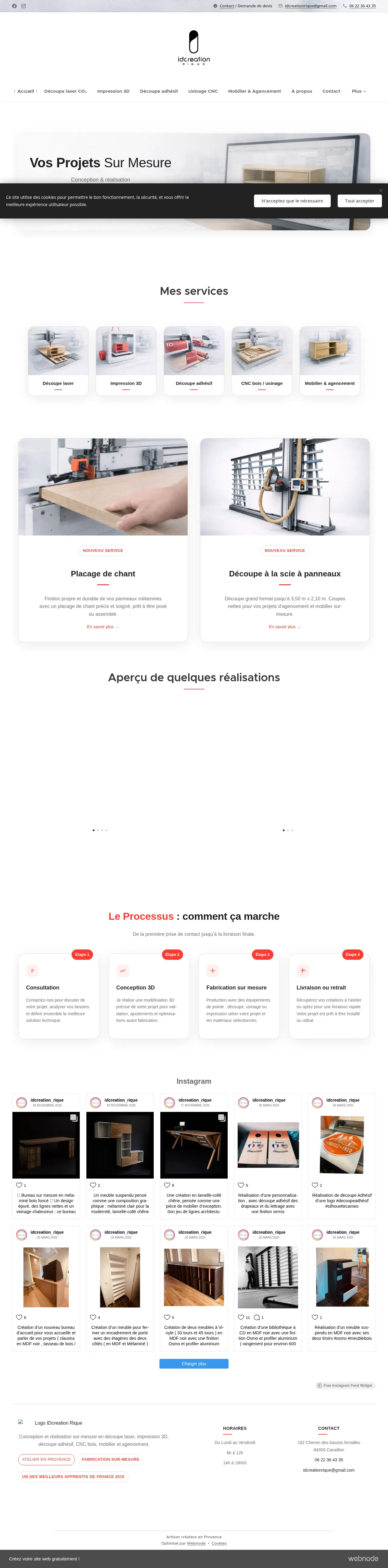 IDCreation Rique is a professional workshop based in Provence specializing in custom design and furniture manufacturing. The company provides a comprehensive suite of services including 3D design, precision machining, laser cutting, and 3D printing for tailored interiors and architectural pieces. They serve clients by managing projects from initial consultation and 3D modeling to final production and delivery. With a focus on high-quality craftsmanship, the workshop handles projects ranging from cabinetry and office furniture to custom graphic signage. Their facility is equipped to process various panels and wood products, ensuring a functional and aesthetic finish for both residential and professional spaces.