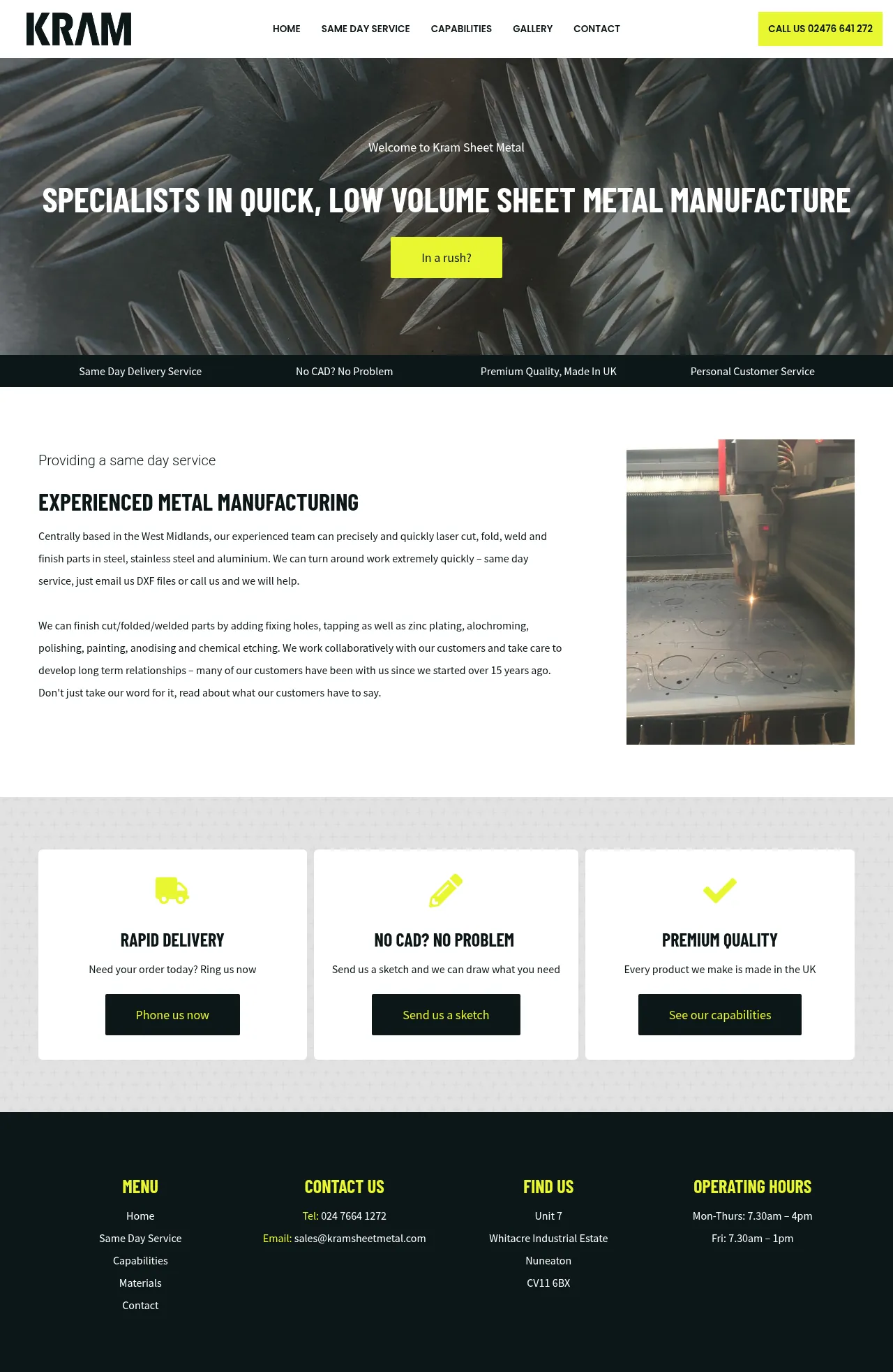 Kram Sheet Metal is a specialized metal fabrication company based in the West Midlands, UK. They provide rapid, low-volume manufacturing services including laser cutting, folding, and welding. The company supports clients from initial design concepts and sketches through to finished components with various surface treatments. Known for their quick turnaround times, they offer same-day service capabilities for urgent projects. Their facility maintains a robust inventory of materials to support consistent and efficient production for long-term partners.