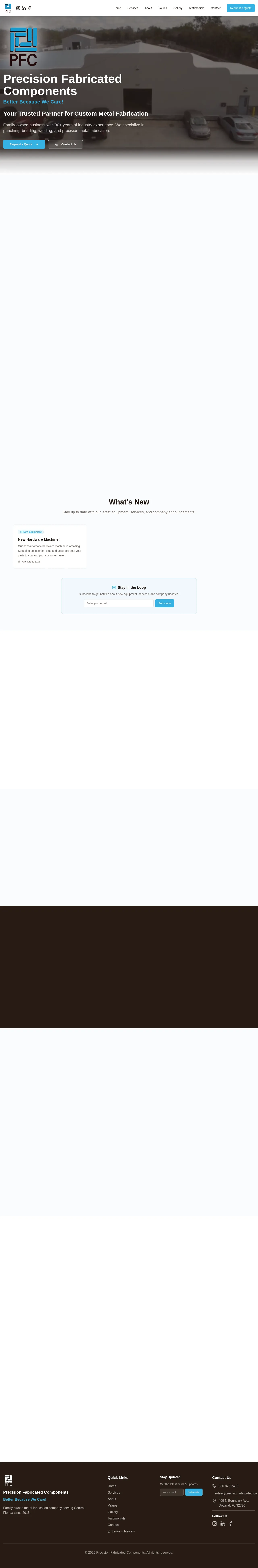 Precision Fabricated Components is a family-owned metal fabrication shop based in DeLand, Florida. With over 30 years of industry experience, the company specializes in sheet metal processing, including punching, bending, and welding. They provide comprehensive manufacturing services ranging from machining and hardware insertion to surface finishing and assembly. The company serves various OEM clients with a commitment to rigorous quality inspection and consistent production standards. Their operations emphasize collaborative teamwork and reliable delivery cycles to meet diverse industrial requirements.