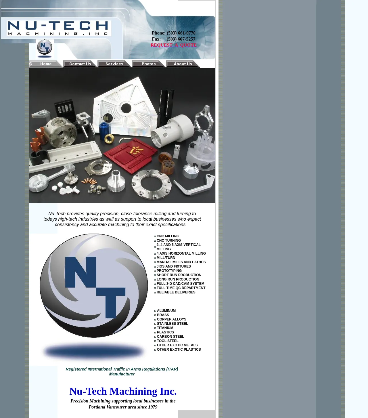 Nu-Tech Machining Inc. is a precision machining company based in the Portland-Vancouver area, providing manufacturing solutions since 1979. The company specializes in CNC milling and turning, supporting clients with both short-run and long-run production needs. Their technical capabilities include 4-axis and 5-axis machining, as well as complex jig and fixture development. Nu-Tech Machining is an ITAR-registered manufacturer and maintains a dedicated quality control department to ensure high-precision, close-tolerance output. They serve a variety of industries by providing reliable prototyping and full-scale manufacturing services.