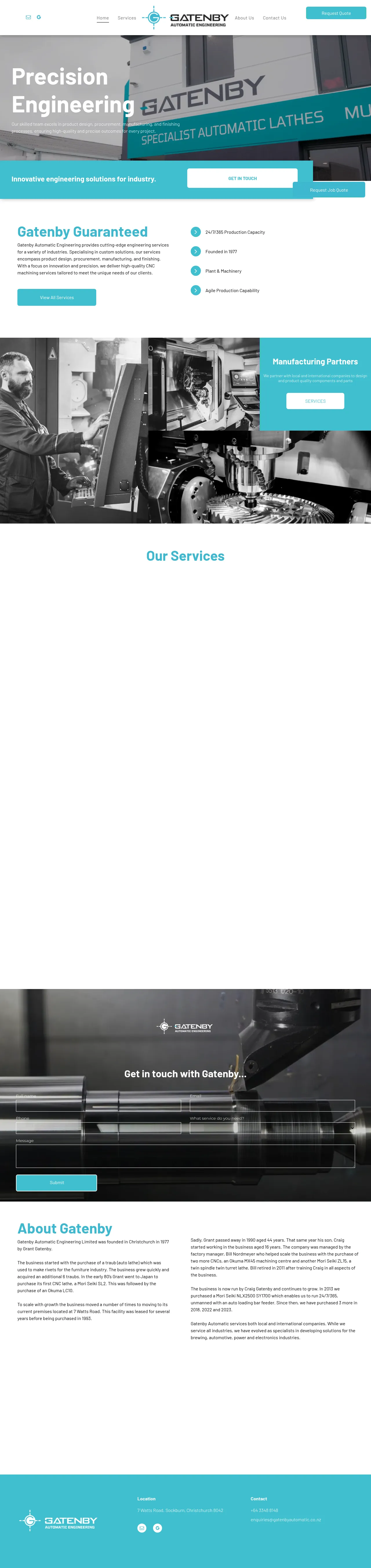 Gatenby Automatic Engineering is a precision manufacturing company established in 1977 based in Christchurch, New Zealand. The firm provides comprehensive engineering solutions including product design, procurement, CNC machining, assembly, and distribution services. Specializing in high-volume production for the brewing, automotive, power, and electronics industries, they maintain 24/7/365 operational capacity. The company utilizes advanced CAD technology and automated equipment to deliver precise, industry-specific custom components. Their team supports both local and international clients through an end-to-end service model, ranging from initial design to supply chain and inventory management.