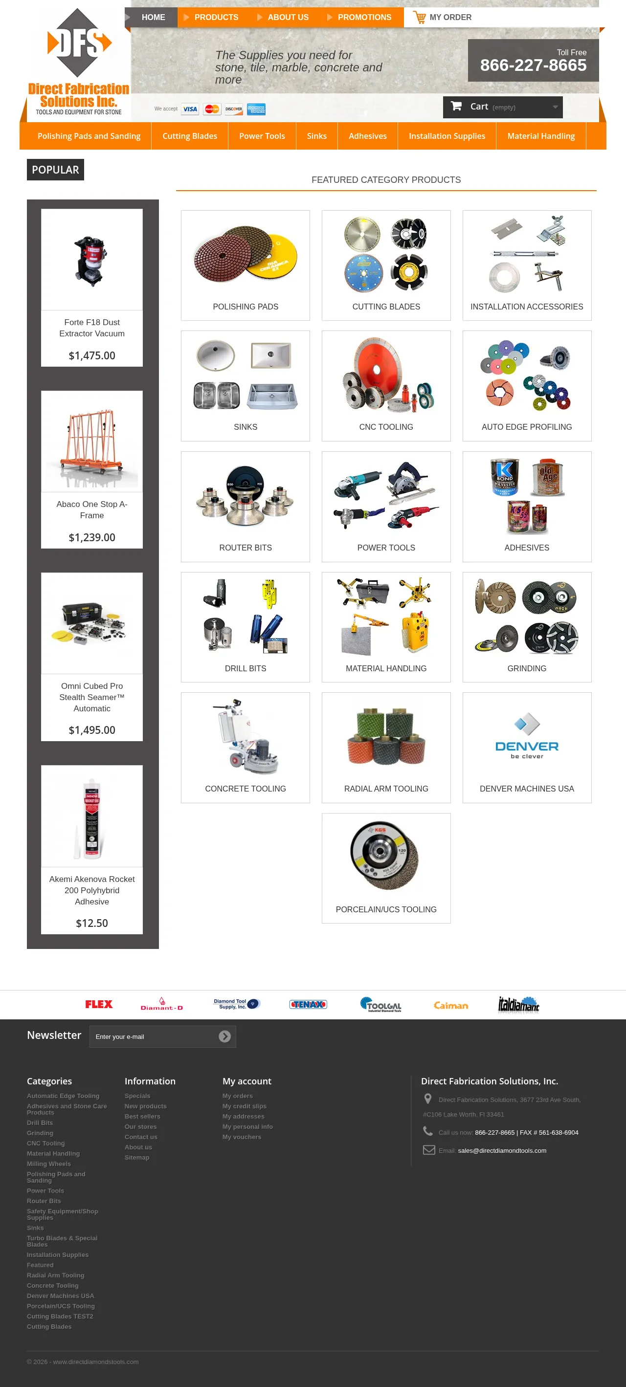 Direct Fabrication Solutions, Inc. is a provider of industrial diamond tooling and precision machining supplies. The company specializes in CNC tooling solutions for the fabrication of stone, ceramic, and composite materials. Their product range includes a vast selection of router bits, core bits, saw blades, and specialized tool holders compatible with various industrial CNC machinery. They serve manufacturers and fabrication shops by supplying high-performance components designed for profiling, cutting, and polishing. The company focuses on providing technical support and quality tooling for advanced machinery setups in the stone and hard-surface industry.