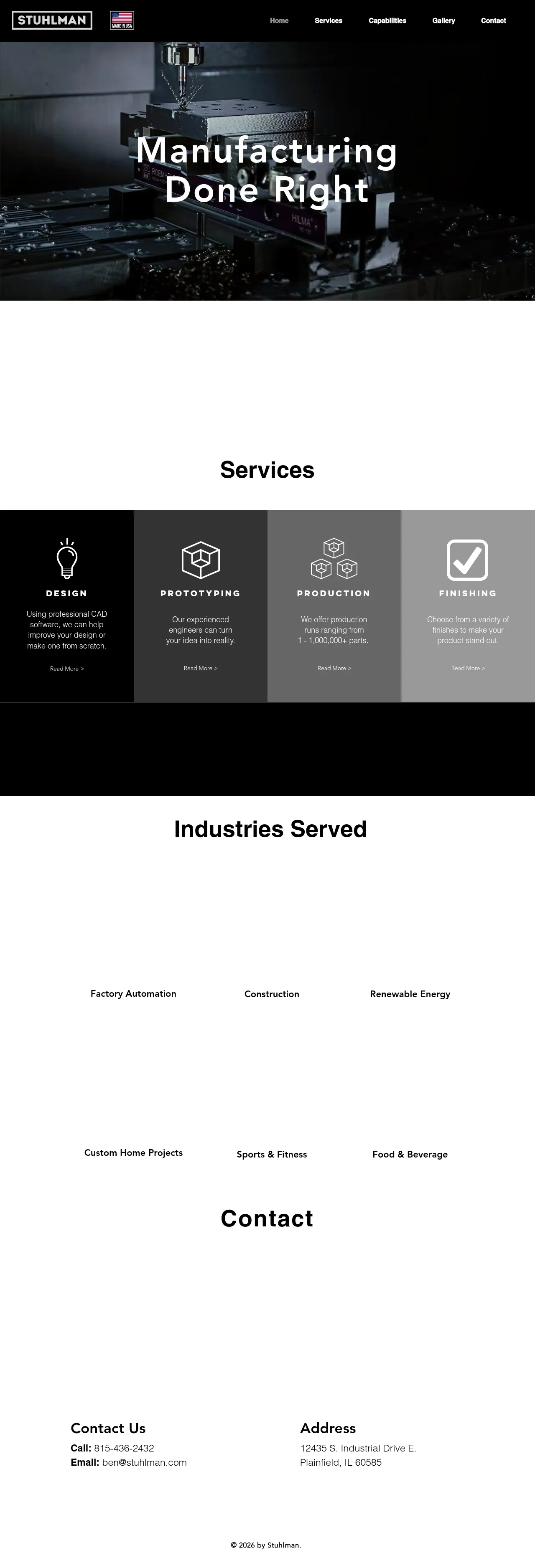 Stuhlman is an industrial manufacturing provider established in 1928 with four generations of experience. The company offers a comprehensive range of services, including CNC machining, sheet metal fabrication, welding, and various finishing processes. They support a diverse client base across industries such as factory automation, renewable energy, construction, and custom projects. With a flexible production capacity ranging from prototyping to large-scale runs, Stuhlman functions as a single-source partner for complex manufacturing requirements. Their engineering team assists clients throughout the design and production process to deliver finished components.