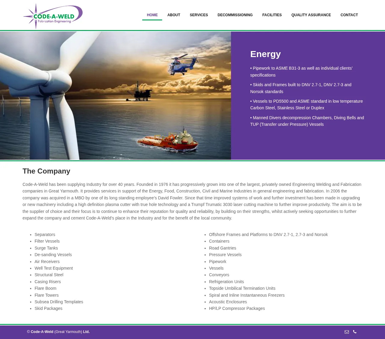Established in 1976, Code-A-Weld is a leading engineering and fabrication firm based in Great Yarmouth. The company specializes in heavy fabrication and structural steelwork for the energy, food, construction, civil, and marine industries. Their capabilities range from pressure vessel manufacturing and pipework to the construction of complex offshore frames and industrial freezing equipment. With over 40 years of industry experience, the company maintains a focus on quality, reliability, and precision engineering. They provide full-service project support, encompassing both workshop-based fabrication and on-site construction.