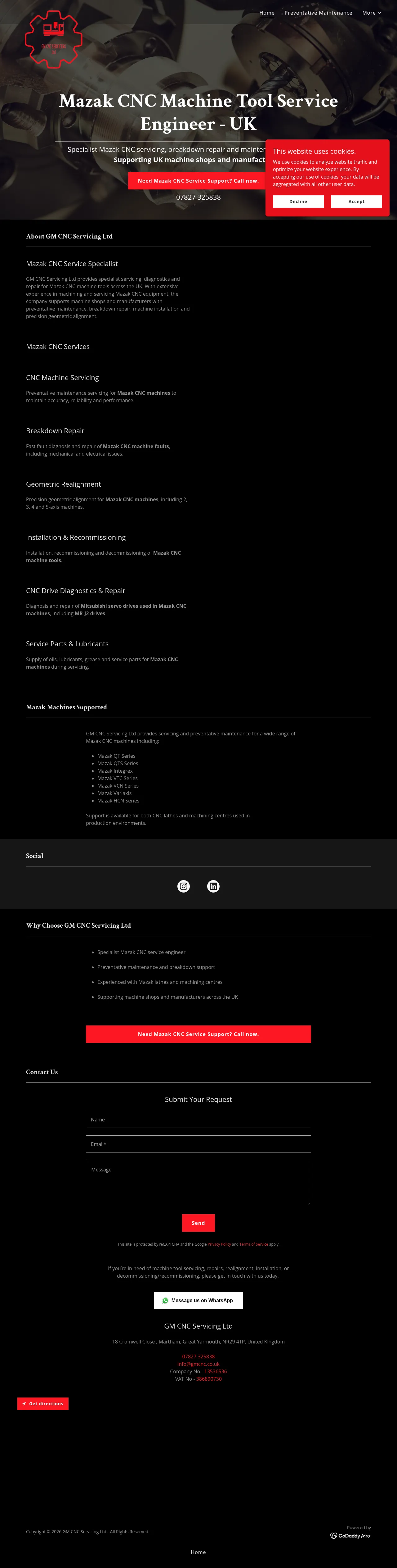 GM CNC Servicing Ltd is a UK-based engineering firm specializing in the maintenance, repair, and geometric realignment of Mazak CNC machine tools. The company provides comprehensive preventative maintenance programs, diagnostic troubleshooting, and breakdown support for manufacturers across various sectors, including oil and gas. By performing thorough inspections of lubrication systems, spindles, and axis components, the firm helps clients reduce unplanned downtime and maintain machining accuracy. Operations are managed in accordance with ISO quality standards, ensuring consistent and professional service delivery. The company supports facilities ranging from small workshops to large multi-machine manufacturing environments.