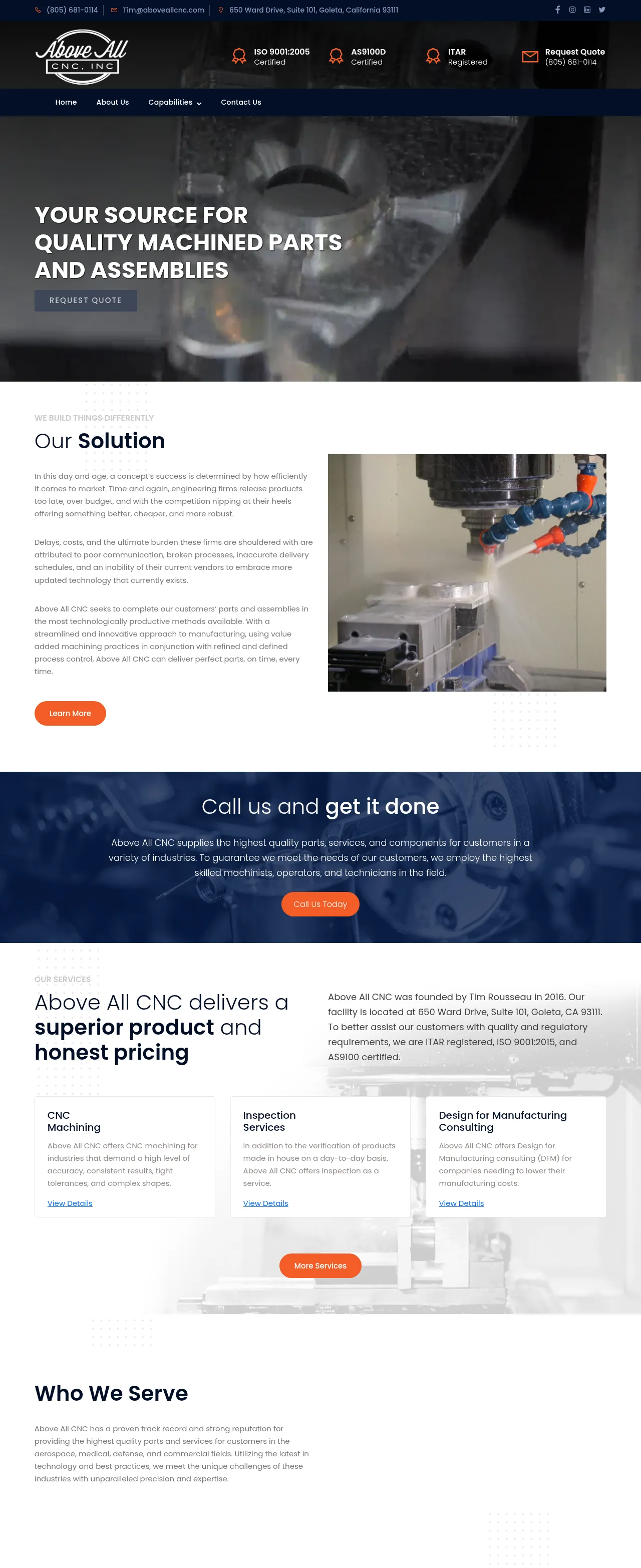 Above All CNC is a precision manufacturing company specializing in CNC machining and assembly for the aerospace, medical, defense, and commercial industries. Established in 2016, the firm focuses on accelerating time-to-market through streamlined process controls and advanced manufacturing technologies. Their service portfolio includes high-accuracy machining, independent inspection services, and design for manufacturing consulting to optimize production efficiency. Committed to stringent quality standards, the company maintains a highly skilled workforce to support complex part requirements. They operate from a certified facility in Goleta, California, ensuring consistent delivery and high-quality results for demanding technical applications.