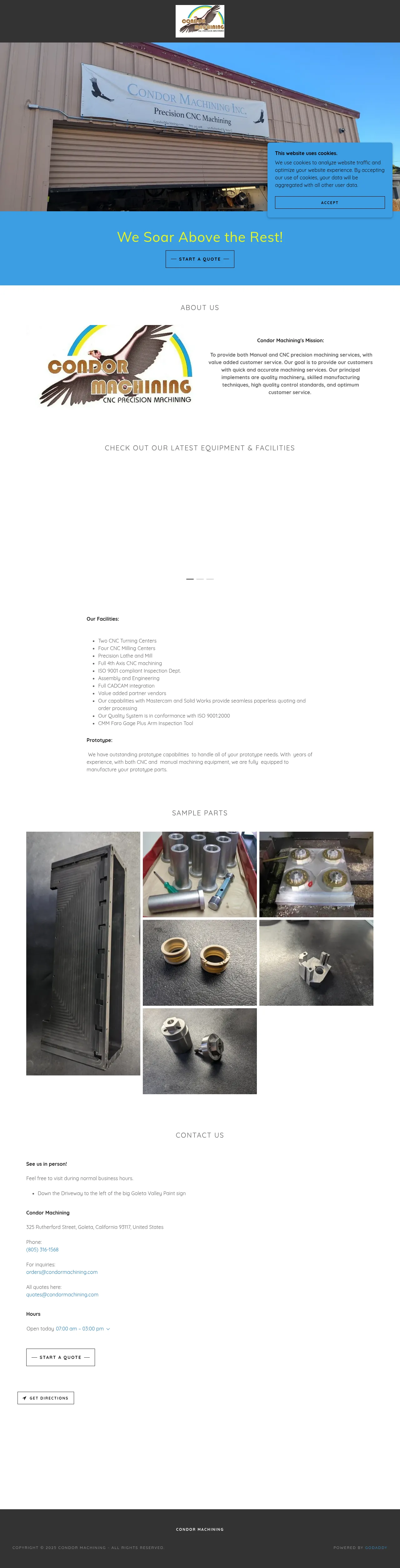 Condor Machining is a manufacturing facility based in Goleta, California, specializing in precision CNC machining and technical assembly services. The company utilizes advanced CAD/CAM software, including Mastercam and SolidWorks, to facilitate paperless quoting and streamlined production workflows. Their service offerings include engineering support, prototype development, and the production of sample parts. With a focus on quality assurance, the firm maintains an inspection department equipped for precision verification. Condor Machining serves as a value-added partner for clients requiring reliable component manufacturing and technical integration.
