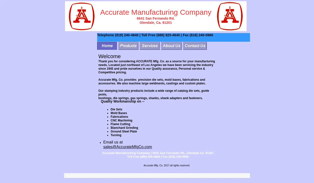 Accurate Manufacturing Company specializes in the production of precision die sets and mold bases for diverse industrial applications. The company provides a comprehensive suite of machining and fabrication services, including CNC machining, turning, and flame cutting. Their facility is equipped to handle complex metalworking projects, offering specialized processes such as Blanchard grinding and the production of ground steel plates. Committed to high-tolerance manufacturing, Accurate Manufacturing Company supports various sectors requiring precise tooling and structural components. The company operates from their Glendale, California facility, maintaining consistent quality standards throughout their production processes.