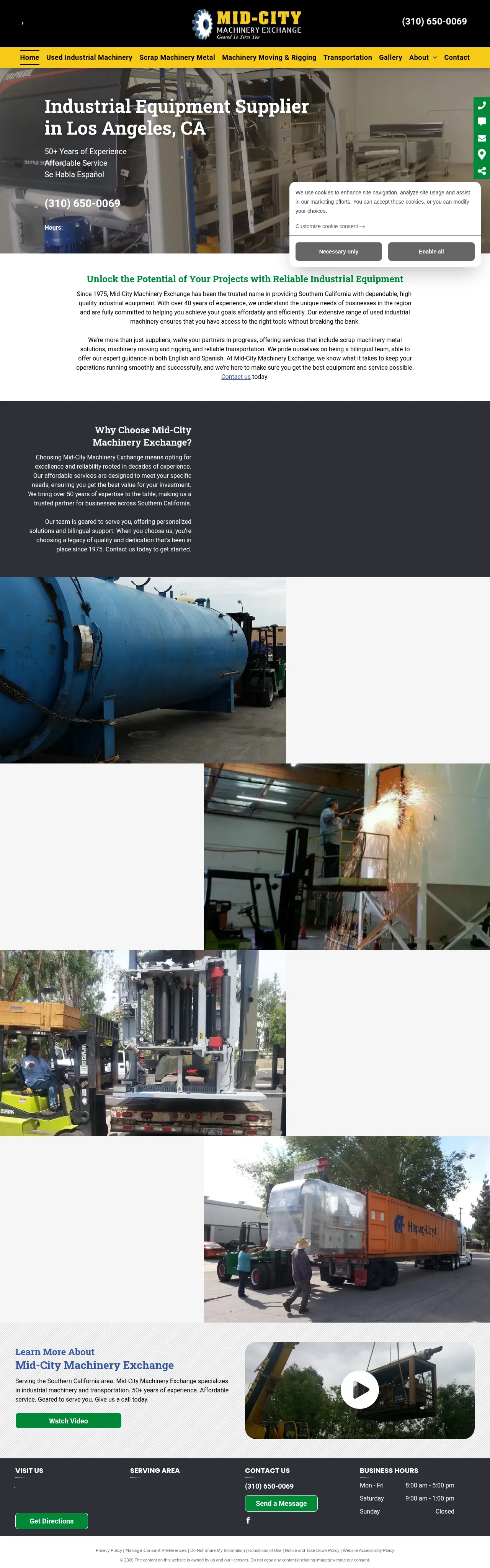 Mid-City Machinery Exchange is an industrial equipment supplier based in Los Angeles, California, with over 50 years of experience in the sector. The company specializes in the purchase, sale, and trade of used industrial machinery, serving diverse sectors including food processing, textile manufacturing, and printing. Their core services include expert machinery rigging, heavy equipment relocation, and comprehensive industrial transportation solutions. The firm offers a bilingual team fluent in English and Spanish, focusing on cost-effective and reliable operational support for their clients. They are recognized for their expertise in managing scrap metal and facilitating the secure movement of heavy-duty production machinery.