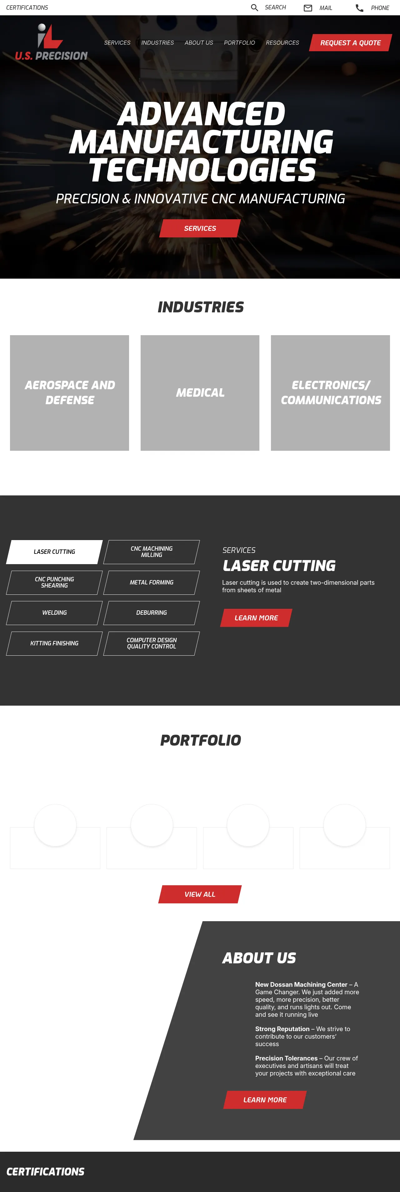U.S. Precision is a contract manufacturer providing precision machining and sheet metal fabrication for the medical industry. The company performs laser cutting, CNC milling (3- and 4-axis), CNC punching/shearing, metal forming, welding, deburring and finishing, and assembly/kitting. Machining, inspection and fabrication are completed in-house with a dedicated quality control staff to verify parts prior to welding and assembly.
