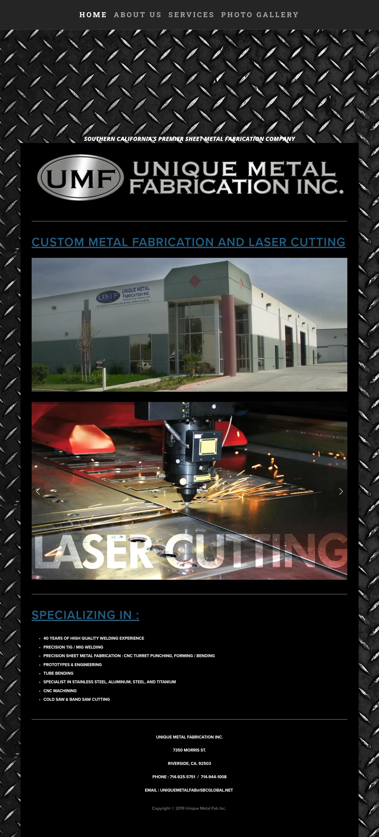 Unique Metal Fabrication Inc. is a family-owned, full-service sheet metal and manufacturing facility in Riverside, California, serving Southern California for over 40 years. The company provides precision sheet metal fabrication, CNC laser cutting, CNC punching, forming and bending, CNC machining, and both MIG and TIG welding. It handles prototype work, complex assemblies, and mandrel tube bending for square, round and rectangular tubing. Materials worked include steel, stainless steel, aluminum and titanium.