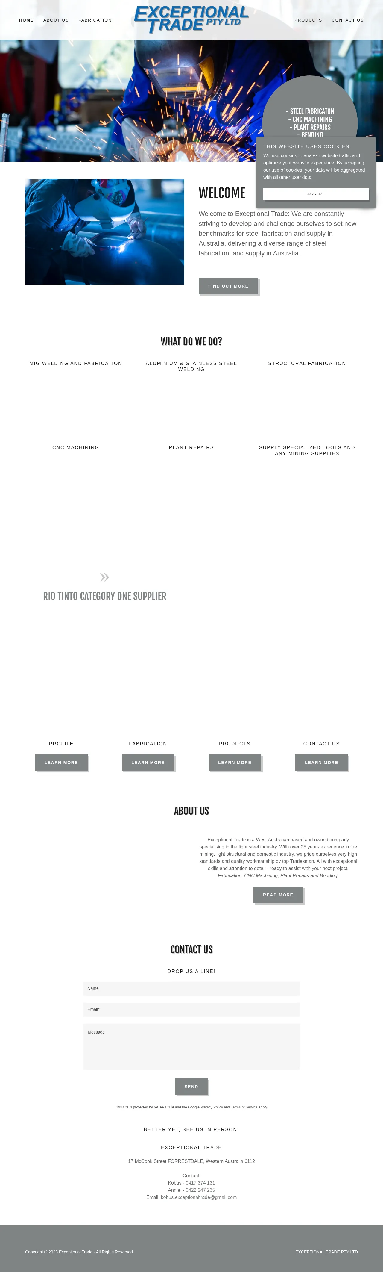 Exceptional Trade is a Western Australian-based fabrication company with over 25 years of experience in the mining, commercial, and residential sectors. They specialize in light steel fabrication, CNC machining, plant repairs, and metal bending services. The company provides a broad range of products including structural steel, pump frames, custom trailers, ute trays, and architectural balustrading. Committed to precision and quality workmanship, the team collaborates closely with stakeholders to ensure all projects meet exact specifications and timelines. Their facility serves as a Category One Supplier for major mining operations in the region.