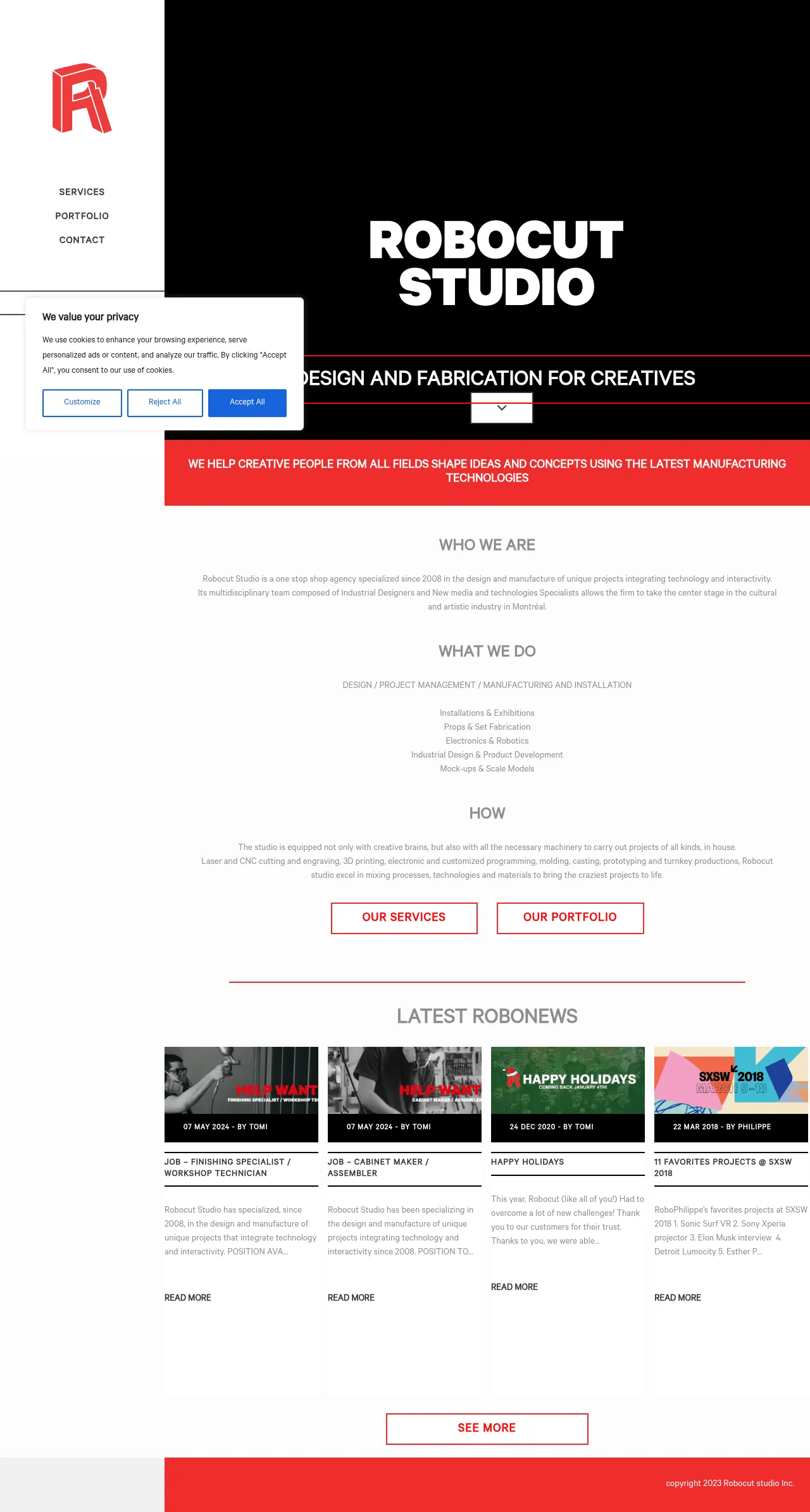 Robocut Studio is a Montreal-based design and digital fabrication agency established in 2008. The company specializes in creating unique projects that integrate advanced manufacturing technologies with interactive elements. Their multidisciplinary team of industrial designers and technology specialists provides comprehensive services ranging from conceptual design to turnkey production and final installation. They serve the cultural, artistic, and creative industries by utilizing a blend of traditional and modern fabrication methods. The studio is equipped to handle complex prototyping, custom props, and specialized installation projects.