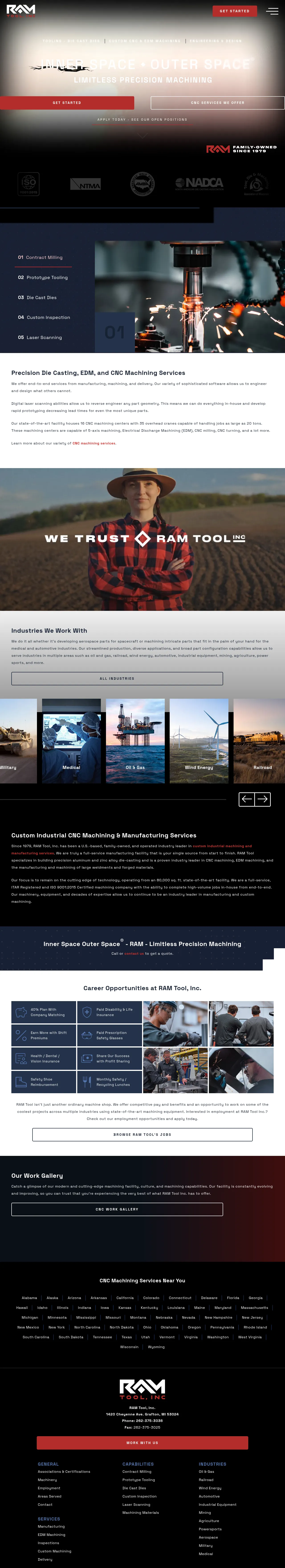 RAM Tool, Inc. is a family-owned manufacturing facility based in Grafton, Wisconsin, specializing in precision CNC machining, electrical discharge machining (EDM), and die-casting services. Established in 1979, the company provides end-to-end manufacturing solutions including reverse engineering, rapid prototyping, and large-scale assembly. Their 80,000-square-foot facility is equipped to manage complex projects, supporting industries such as aerospace, medical, automotive, and energy. The firm maintains strict quality control through in-house documentation and inspection, serving as a single-source provider from initial consultation to final delivery.
