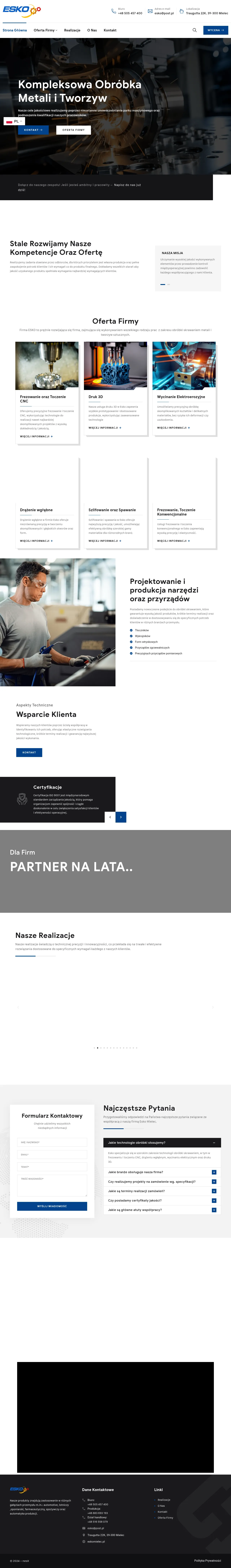Esko Mielec is a professional manufacturing facility specializing in comprehensive metal and plastic processing. The company provides a wide range of services including CNC turning and milling, electrical discharge machining, sinker EDM, and 3D printing. They serve diverse industrial sectors, such as automotive, aerospace, pharmaceutical, food production, and welding tool manufacturing. The business is committed to precision and quality, supported by a modern machine park and adherence to international quality standards. Clients can request custom-made projects based on provided technical documentation or prototypes, with an emphasis on short turnaround times and operational efficiency.