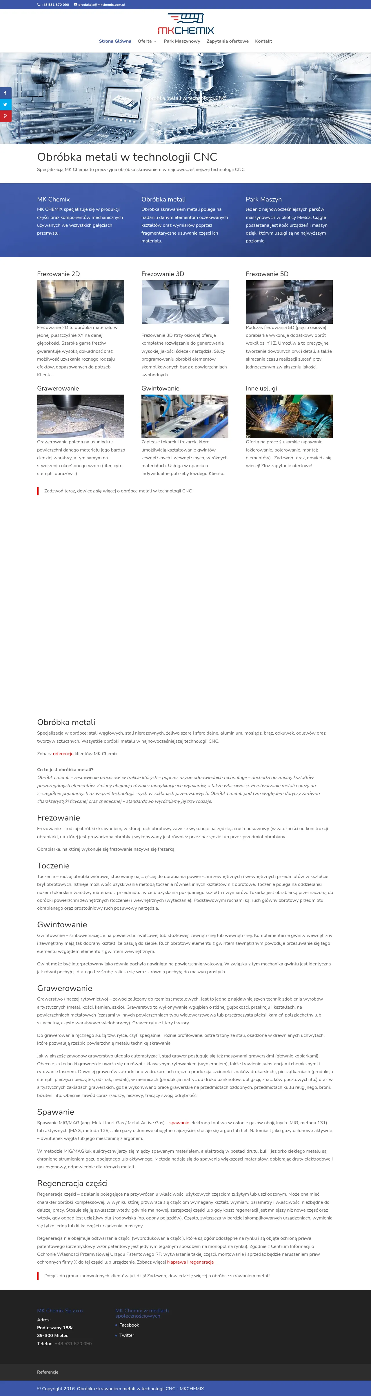 MK Chemix is a specialized industrial manufacturing company based in Mielec, Poland, providing precision metalworking services for over 10 years. The company serves the automotive, electrical, machinery, and optical sectors throughout Europe by utilizing advanced CNC machining technologies. Their core capabilities include multi-axis CNC milling, turning, metal fabrication, and professional surface treatments such as sandblasting. The facility is equipped with a modern machine park capable of handling complex geometries and high-precision components. MK Chemix emphasizes individualized solutions and reliable technical support to meet specific client requirements.
