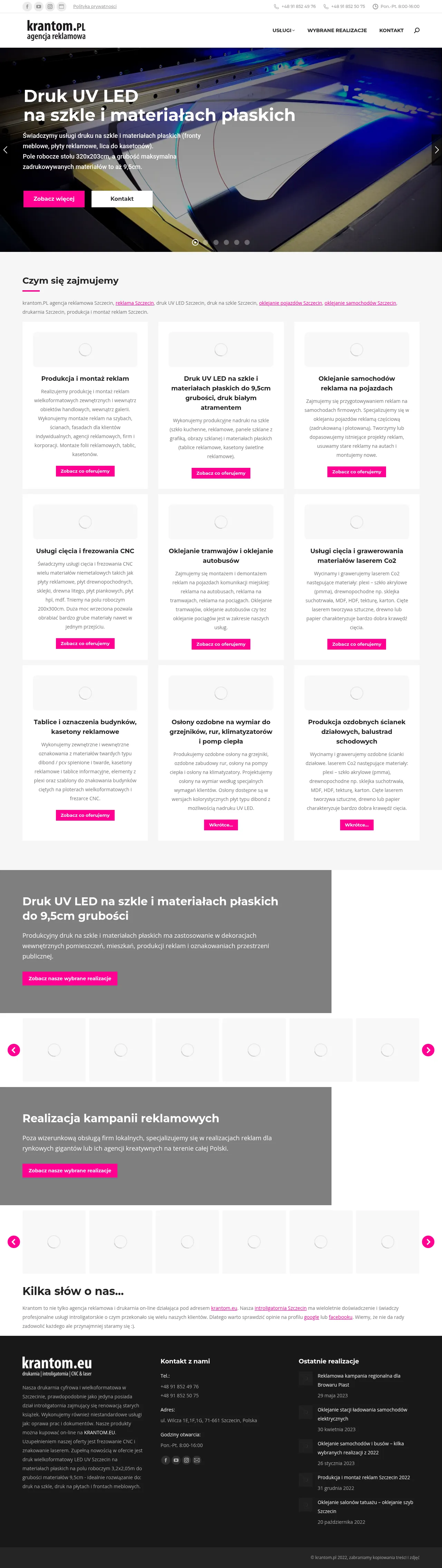 Krantom provides CNC milling and cutting and produces large-format exterior and interior advertising and signage. The company supplies and installs vehicle wraps, vinyl graphics, lightboxes, advertising boards and printed glass panels for retail, corporate and agency clients. They work with a range of sheet and flat materials including Dibond, PVC, acrylic, wood, MDF and glass and offer installation on windows, walls and building façades across Poland.
