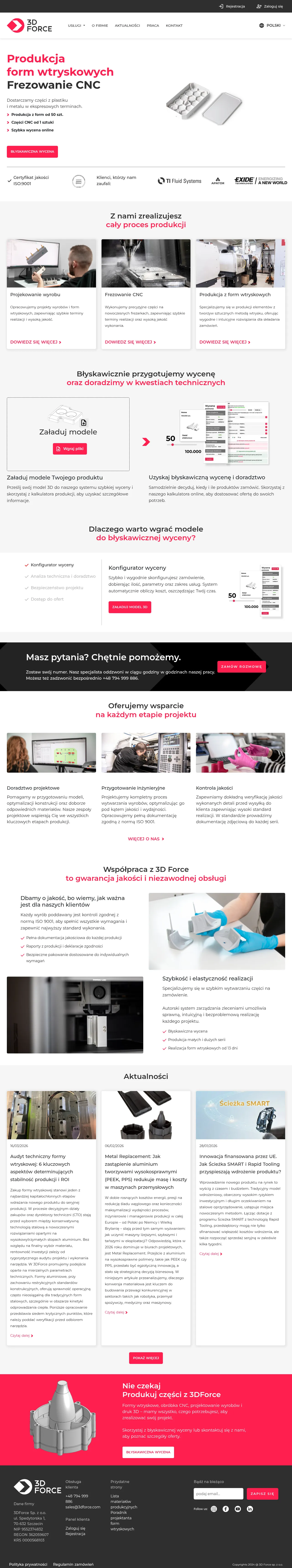 3DForce Sp. z o.o. is a manufacturing service provider offering CNC machining, injection mold tooling and production, product design, and 3D printing. The company performs precision 3- and 4-axis milling of metal and plastic components and manufactures parts from single prototypes to full series. Quality management follows ISO 9001 and products undergo advanced inspection procedures.