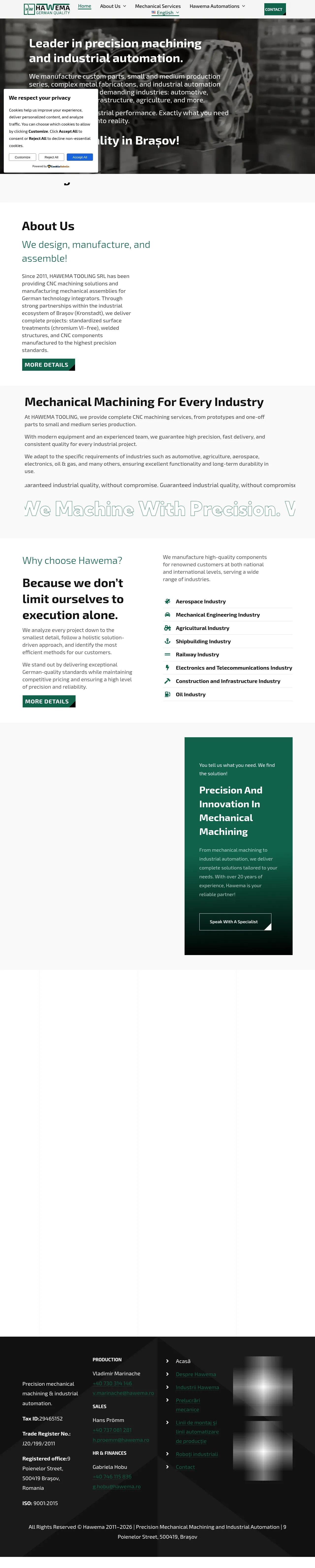 HAWEMA TOOLING SRL is a precision engineering company based in Brașov, Romania, specializing in CNC mechanical machining and industrial automation solutions. Established in 2011, the company designs, manufactures, and assembles custom mechanical components, welded structures, and complex sub-assemblies for a variety of demanding industries, including aerospace, automotive, energy, and infrastructure. Their service portfolio spans from precision machining processes like milling, turning, and drilling to specialized surface treatments and 3D measurement. With over 20 years of technical experience, the company provides end-to-end support from project analysis and prototyping to final assembly and quality control. They are recognized for maintaining high precision standards and efficient production workflows for both small batches and medium-series manufacturing.