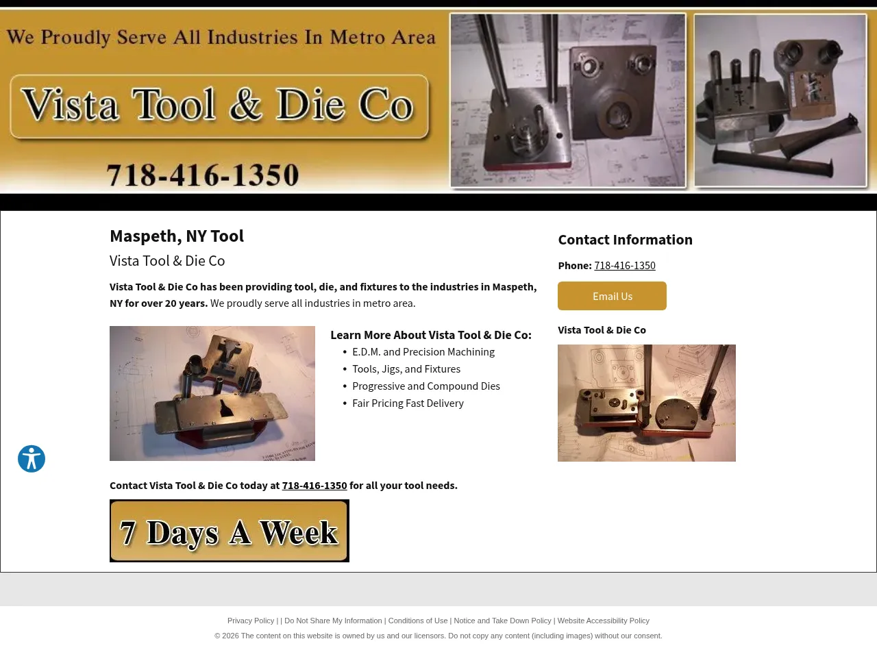 Vista Tool & Die provides specialized manufacturing solutions, including precision machining and custom tooling services. The company serves a diverse range of industries within the metropolitan area. Core capabilities include Electrical Discharge Machining (EDM), the fabrication of jigs and fixtures, and the production of progressive and compound dies. Known for a commitment to efficiency, the firm emphasizes competitive pricing and rapid turnaround times for all projects.
