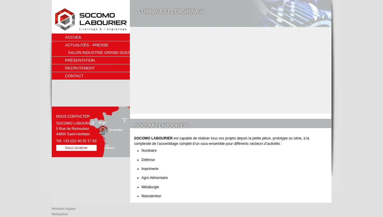 SOCOMO LABOURIER is a specialized manufacturing company based in Saint-Herblain, France, operating under the ARMORIC HOLDING group. The company provides machining and gear manufacturing services ranging from prototype development to full sub-assembly production. They serve diverse industrial sectors including nuclear, defense, printing, food processing, metallurgy, and material handling. The facility features a high-technology machine park and an internal design office to accommodate specific client technical requirements. Dedicated to quality and precision, the firm maintains professional standards for complex industrial projects.