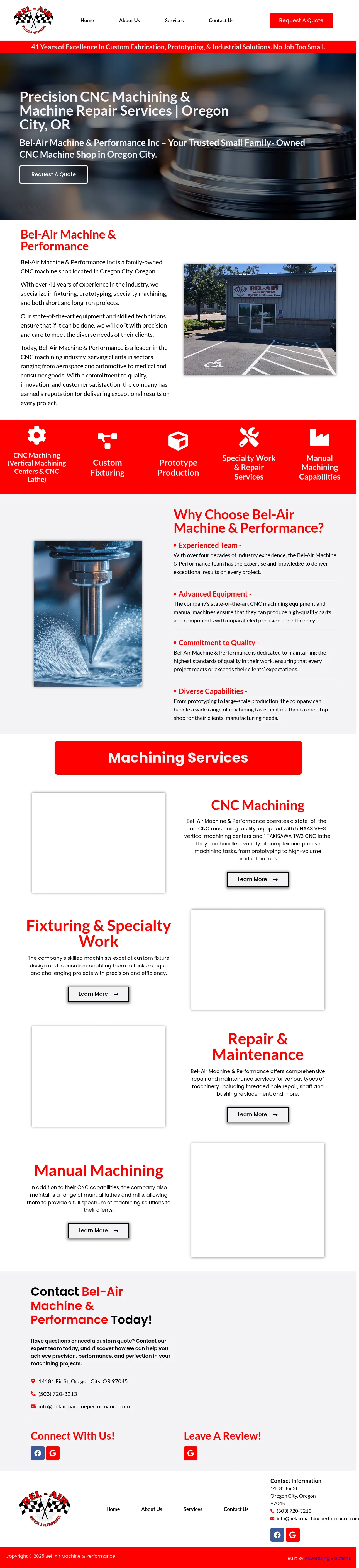 Bel Air Machine Performance is a precision manufacturing provider located in Oregon City, Oregon. The company specializes in both CNC and manual machining services, supporting projects ranging from initial prototyping to high-volume production. Their facility is equipped to manage custom fixture design, fabrication, and complex component manufacturing. By utilizing a combination of advanced CNC technology and traditional manual equipment, they cater to diverse industrial requirements. The company emphasizes high-quality output and precision to assist clients in meeting demanding performance standards.
