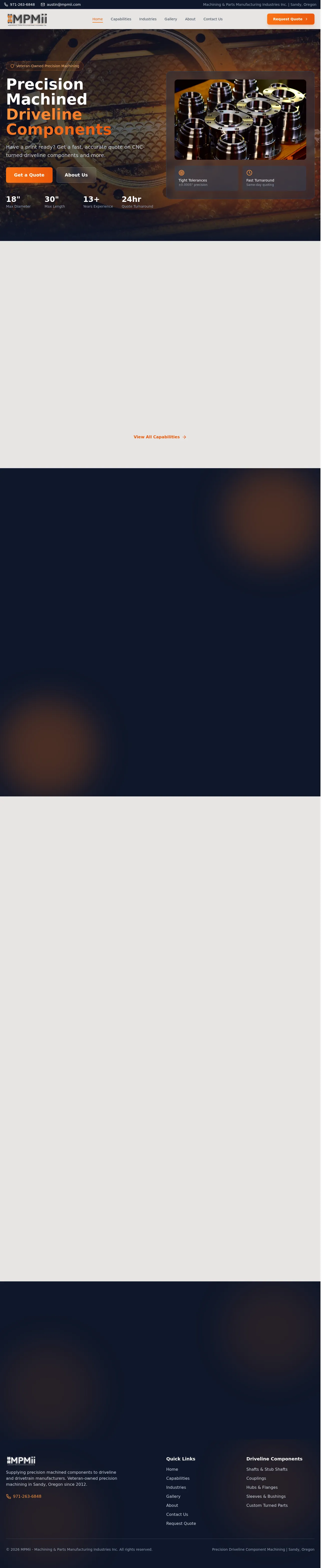 MPMii is a veteran-owned machine shop based in Sandy, Oregon, specializing in precision-turned components for driveline and power transmission applications. The company supports manufacturers across the automotive, marine, heavy equipment, industrial, and energy sectors. Their technical capabilities include CNC turning, milling, precision boring, and thread cutting for components such as shafts, hubs, and flanges. With a focus on high-repeatability and tight-tolerance production, MPMii provides both prototype and full production run services. The shop is noted for its fast quote turnaround times and commitment to clear communication and consistent quality standards.
