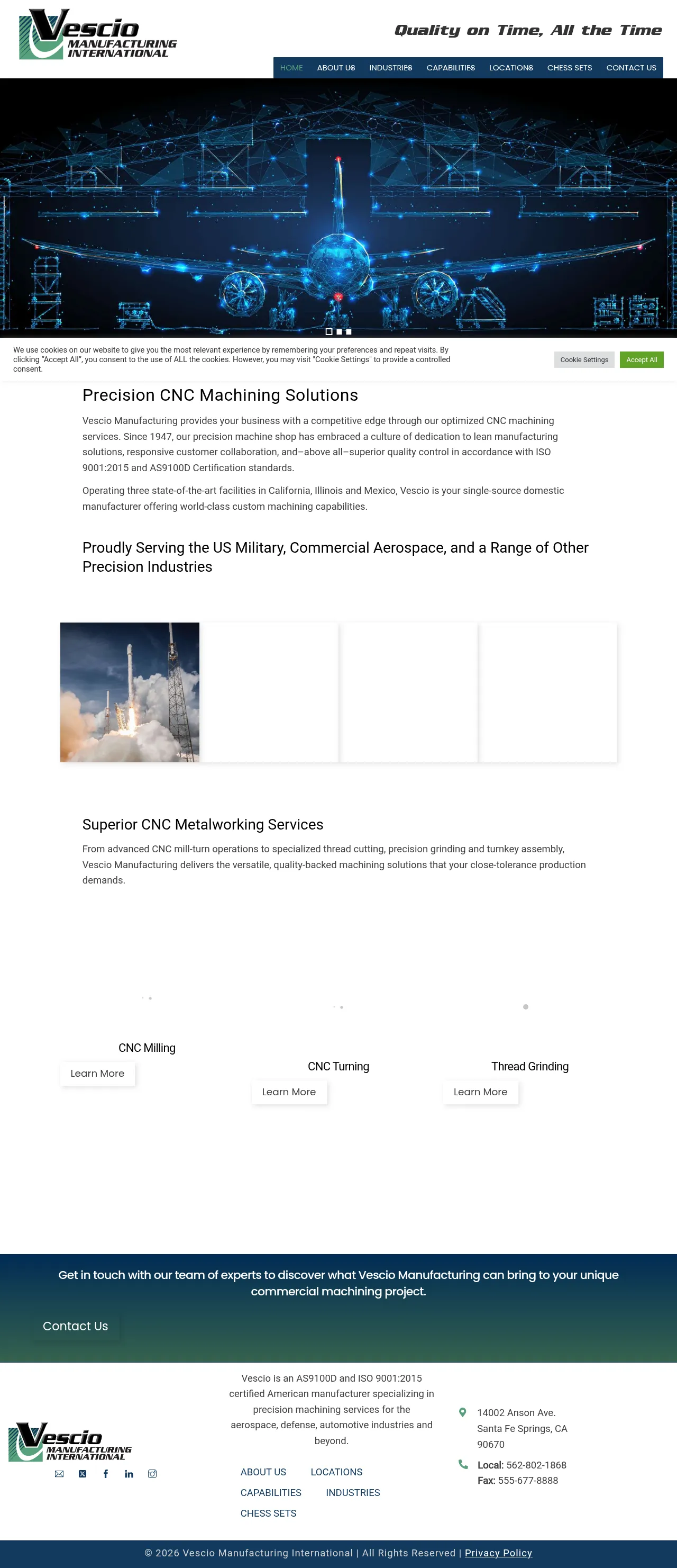 Vescio Manufacturing International is a multi-facility CNC machining company providing precision components for the aerospace, defense, medical, and industrial sectors. Established in 1947, the firm operates facilities in California, Illinois, and Mexico, offering services ranging from custom threading to turnkey assembly and kitting. The company maintains close-tolerance production standards, supported by a workforce with extensive industry tenure. Vescio emphasizes lean manufacturing principles and responsive service to support both low- and high-volume commercial production requirements.