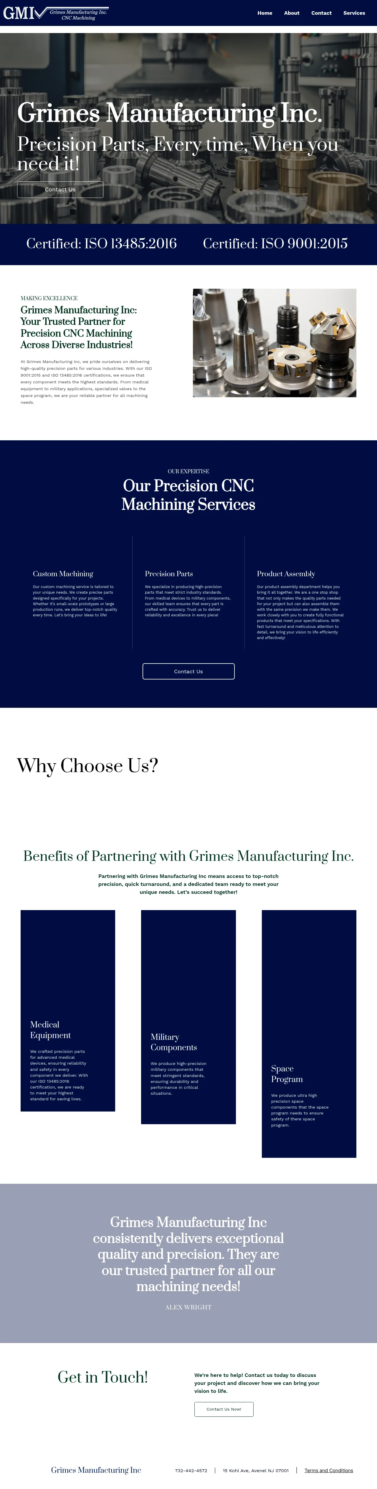 Grimes Manufacturing Inc. is a precision CNC machining provider specializing in custom component fabrication for the medical, military, and aerospace industries. The company offers end-to-end solutions, ranging from initial design collaboration and prototyping to large-scale production runs. Beyond machining, they provide integrated product assembly services to deliver fully functional components to client specifications. Their operations are supported by a commitment to rigorous quality management and timely delivery protocols. The firm emphasizes a collaborative approach to ensure complex engineering requirements are met with accuracy and reliability.