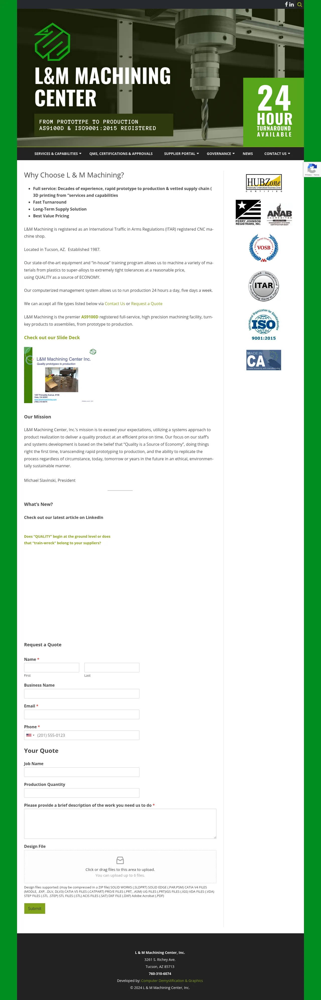 L & M Machining Center, Inc. is a machining and prototyping company based in Tucson, Arizona. The company provides 3D printing and prototyping, CNC milling and turning, and component assembly for industrial customers. It uses a computerized production management system and operates regular production five days a week.