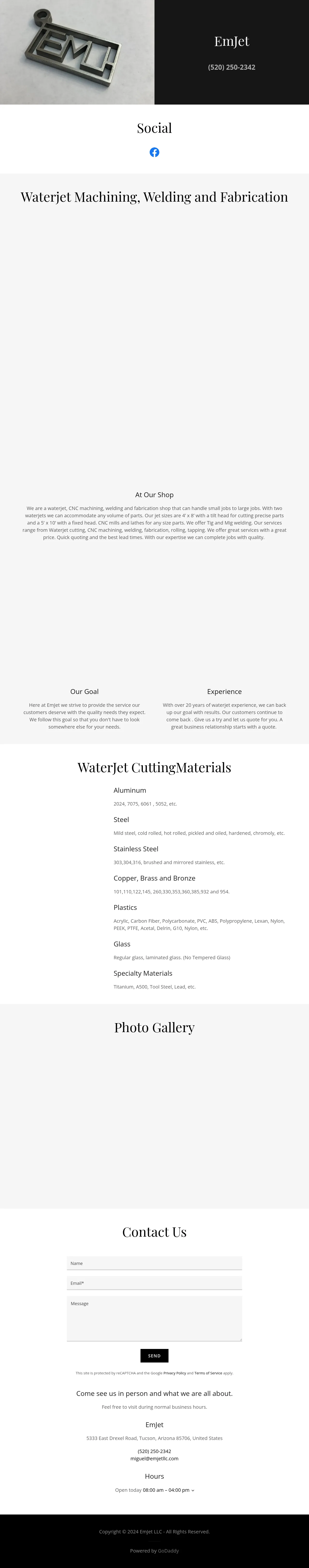 EmJet LLC is a fabrication shop specializing in waterjet cutting, CNC machining, welding and metal fabrication for small- to large-volume jobs. The shop operates two waterjet systems and maintains CNC mills and lathes to produce precision parts. Welding capabilities include TIG and MIG, and additional services include plate rolling and tapping. EmJet emphasizes fast quoting and short lead times supported by over 20 years of waterjet experience.