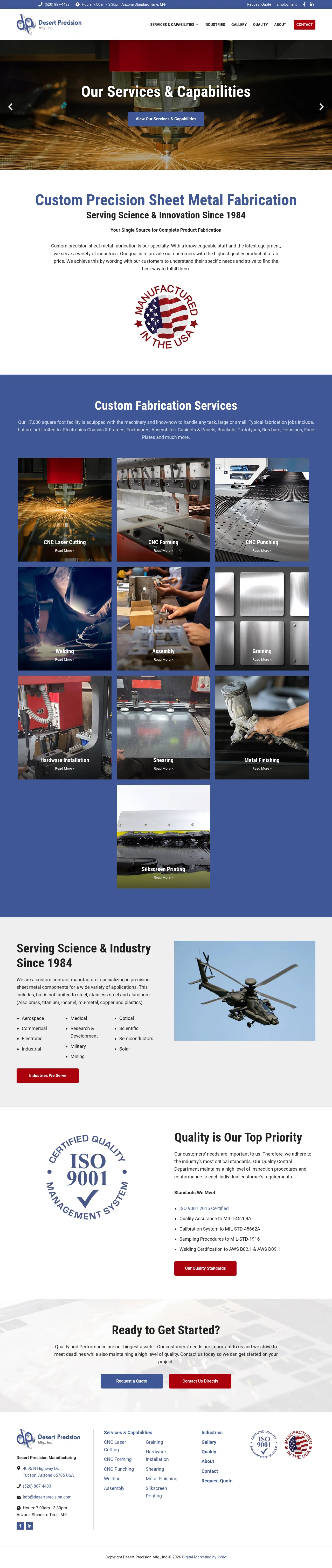 Desert Precision is a custom contract manufacturer specializing in precision sheet metal fabrication. The company produces components and assemblies from common and specialty metals and plastics for a wide range of industries. Its 17,000 square foot facility is equipped with CNC laser cutting, forming, punching, welding and finishing equipment to support prototyping and production runs. Desert Precision maintains a documented quality management system and holds ISO 9001:2015 certification.