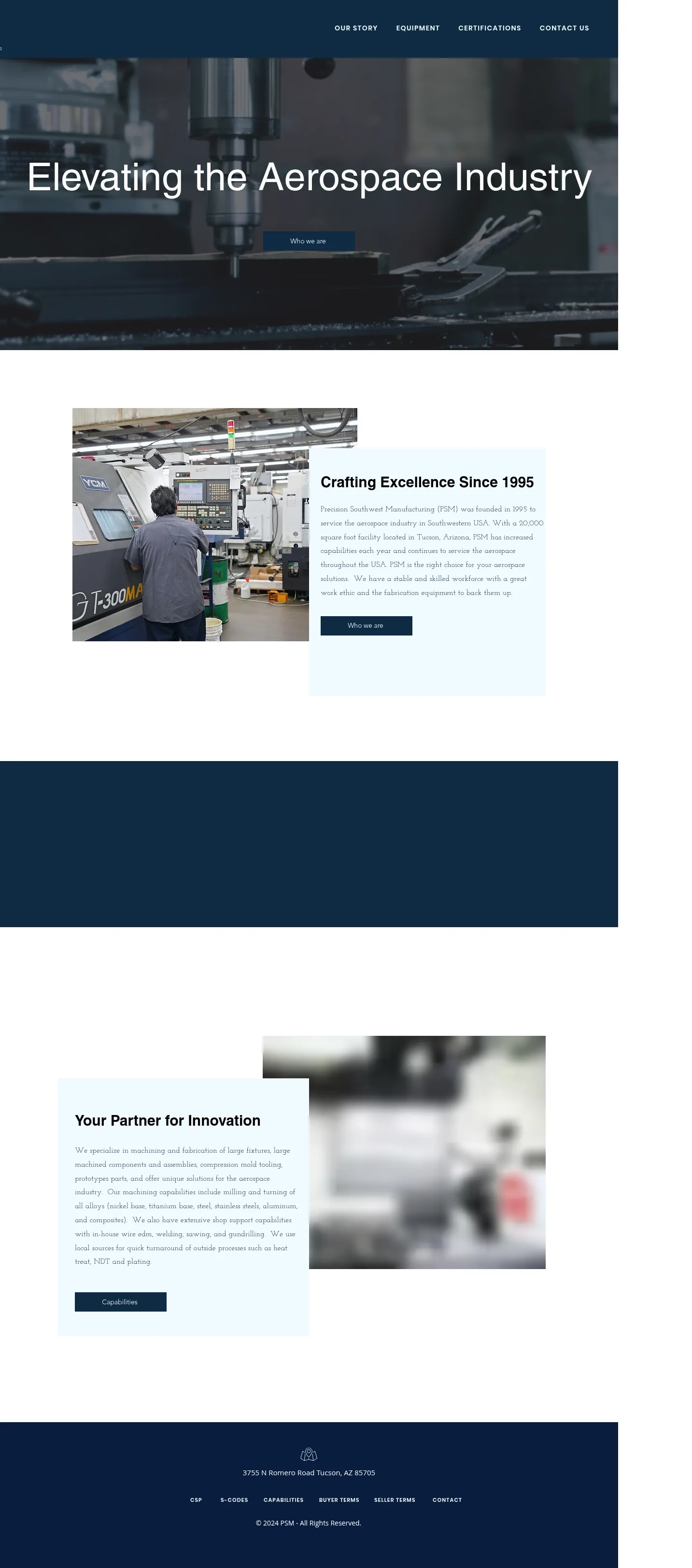 Precision Southwest Manufacturing (PSM) is a Tucson, Arizona-based aerospace machining and fabrication company founded in 1995. The company operates a 20,000 sq ft facility serving aerospace customers across the United States. PSM specializes in large fixtures, machined components and assemblies, compression mold tooling, and prototype parts. In-house capabilities include milling and turning of a wide range of alloys, wire EDM, welding, sawing, gundrilling, and shop support for outsourced heat treat, NDT, and plating.