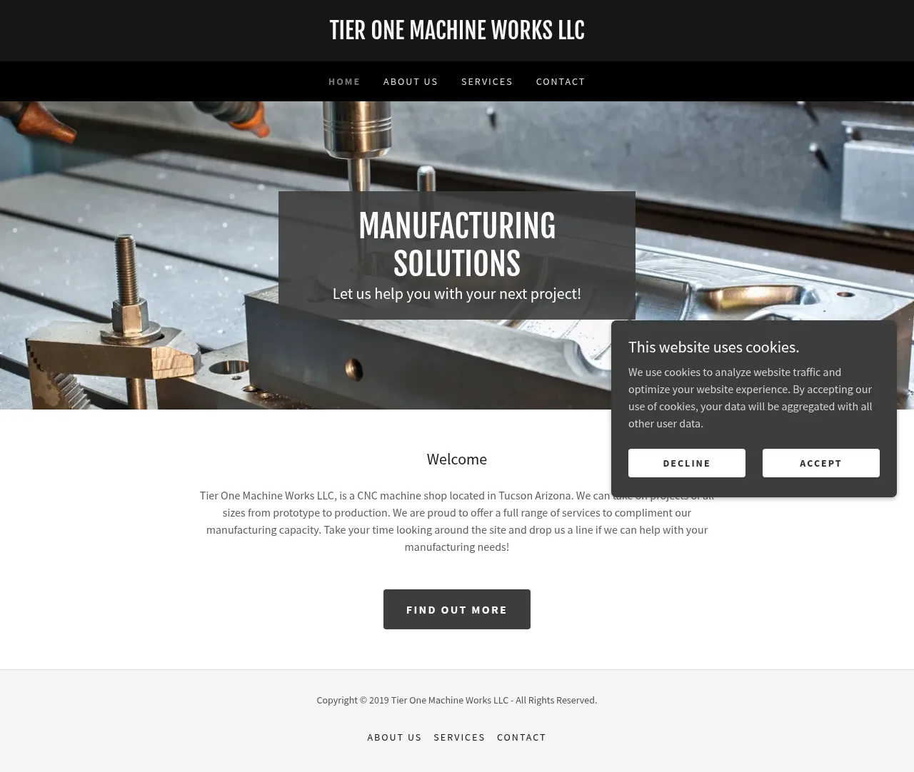 Tier One Machine Works LLC is a CNC machine shop based in Tucson, Arizona, serving projects from one-off prototypes to production runs. The company provides contract manufacturing with dedicated production capacity and complementary services including inventory management, kitting, assembly, testing, finishing and shipping. It also offers prototyping, short-run production and manufacturability consulting to help reduce production costs.