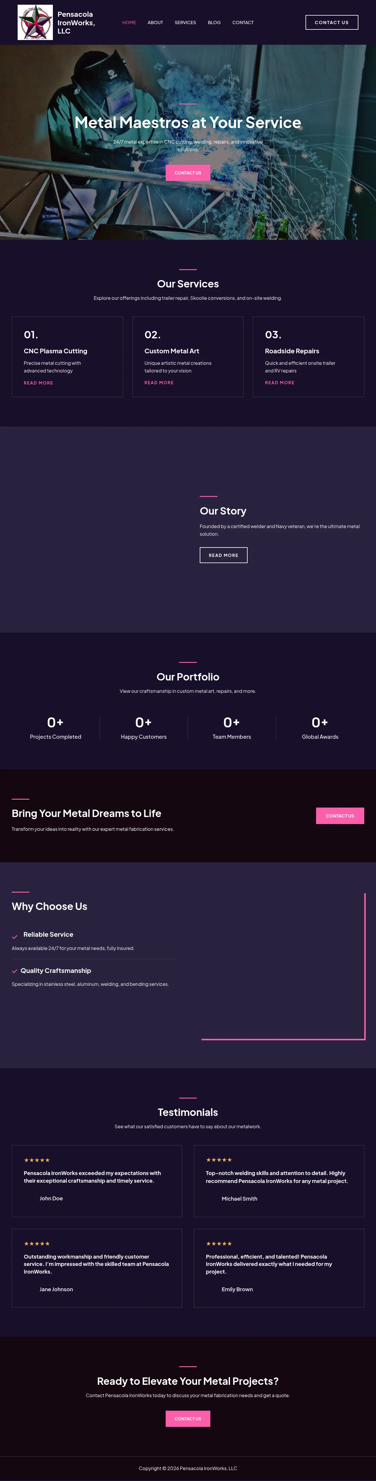 Pensacola IronWorks is a professional metal fabrication company specializing in custom metal solutions for residential and commercial applications. The firm provides a comprehensive suite of services, including CNC plasma cutting, precision welding, and on-site repair work for trailers and recreational vehicles. Founded by a veteran professional, the company emphasizes technical precision and structural durability across all projects. They serve a diverse client base by offering both shop-based fabrication and mobile welding support. The business is noted for its ability to transform custom designs into finished metal products using advanced cutting technologies.