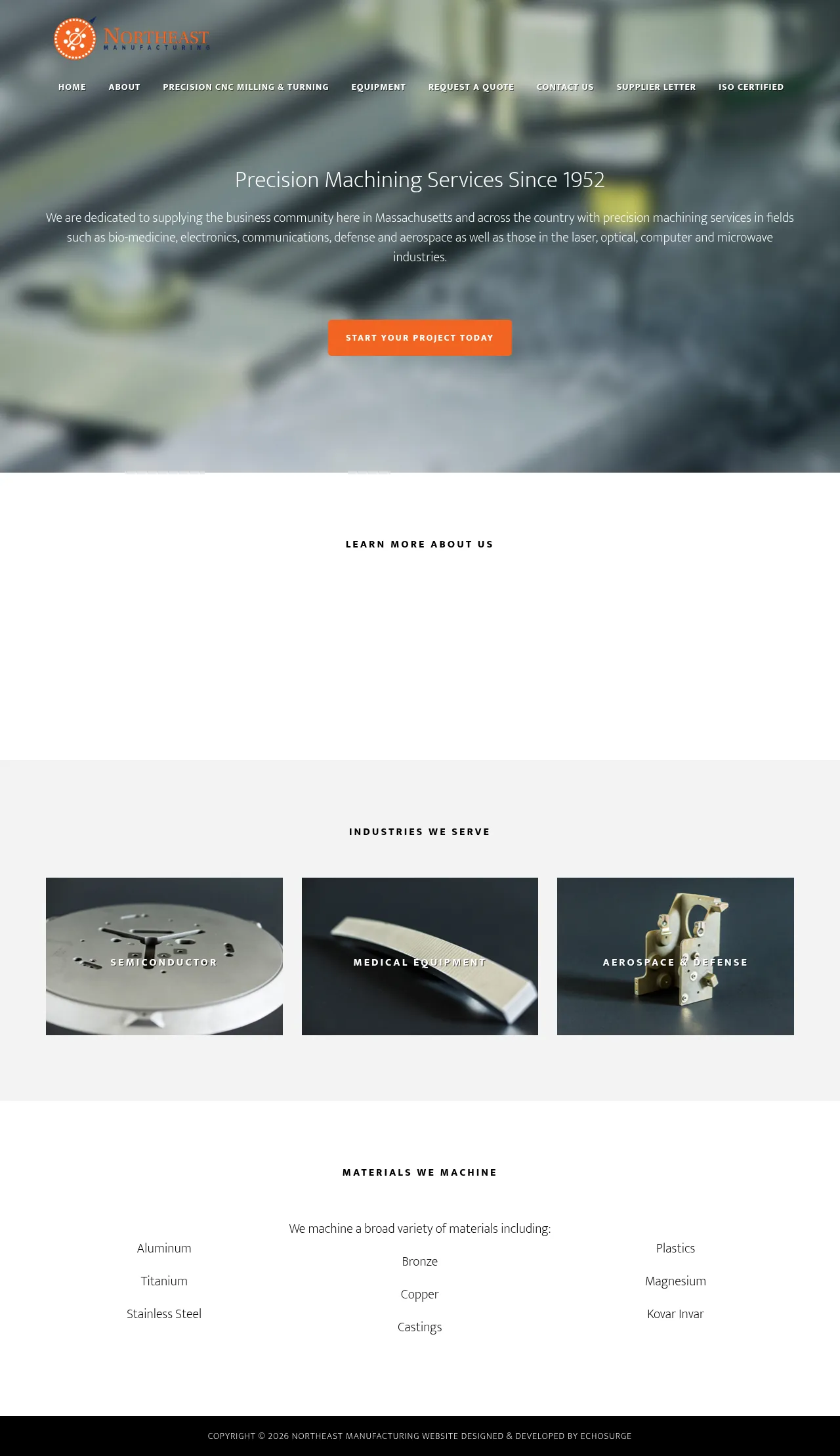 Northeast Manufacturing is a precision machining company established in 1952 based in Stoneham, Massachusetts. The company specializes in providing high-tolerance machining services to a diverse client base across the United States. Their expertise supports critical sectors including aerospace, defense, bio-medicine, electronics, and semiconductor manufacturing. Utilizing a wide range of materials, the firm is equipped to handle complex projects for the communications, laser, optical, and microwave industries. They maintain a commitment to professional service and precision engineering standards for business-to-business manufacturing requirements.