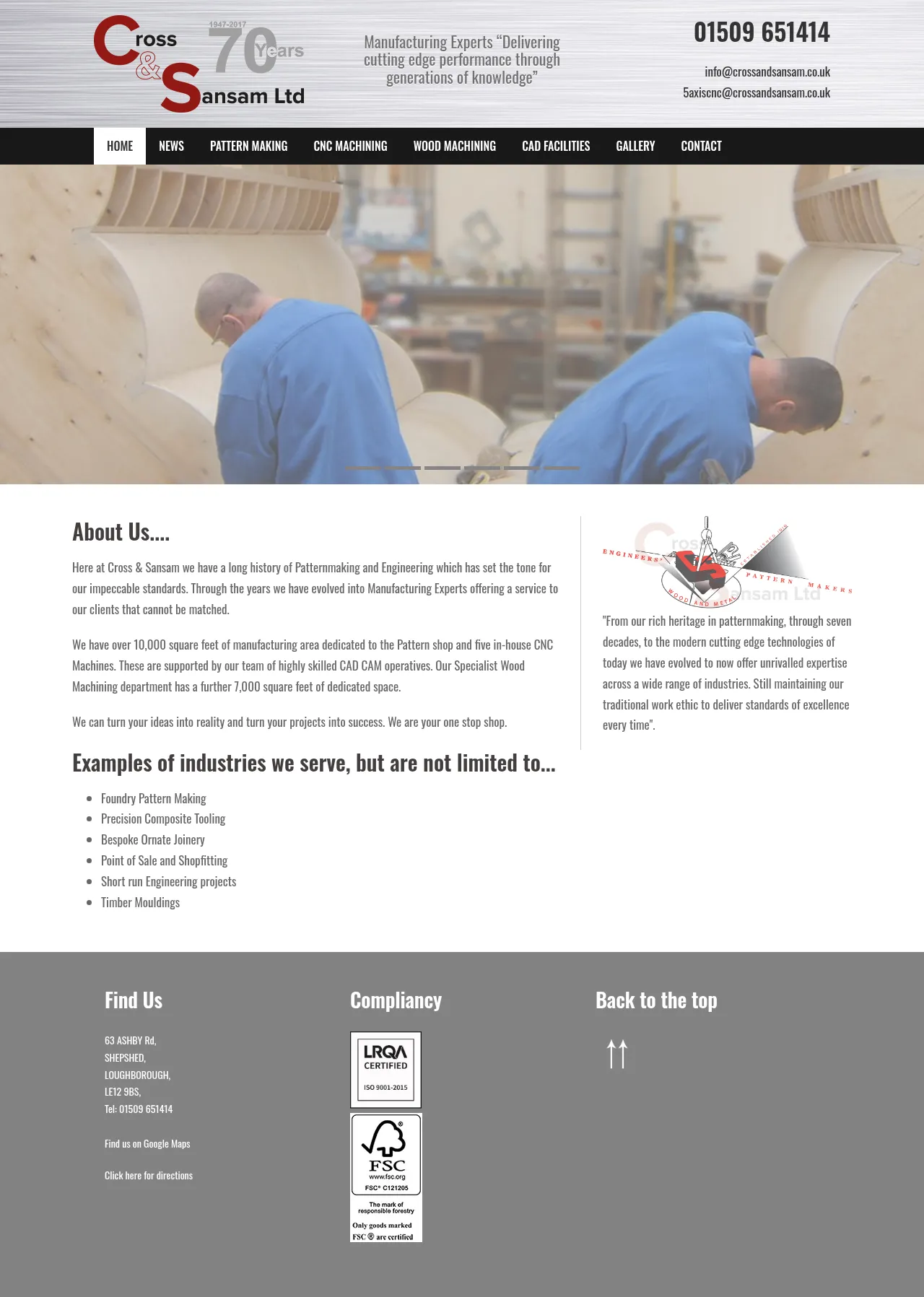 Cross and Sansam is a manufacturing company specializing in pattern making, CNC machining, and specialized wood machining. Operating out of a 17,000 square-foot facility, the company provides comprehensive services ranging from CAD design and CAM programming to full-scale assembly and inspection. They serve diverse industries including foundry pattern making, precision composite tooling, bespoke joinery, and shopfitting. Utilizing advanced 5-axis and 3-axis machinery, the company supports clients from initial design concepts through to final product delivery. Their commitment to quality is reinforced by 3D scanning capabilities and a focus on meeting precise model data requirements.