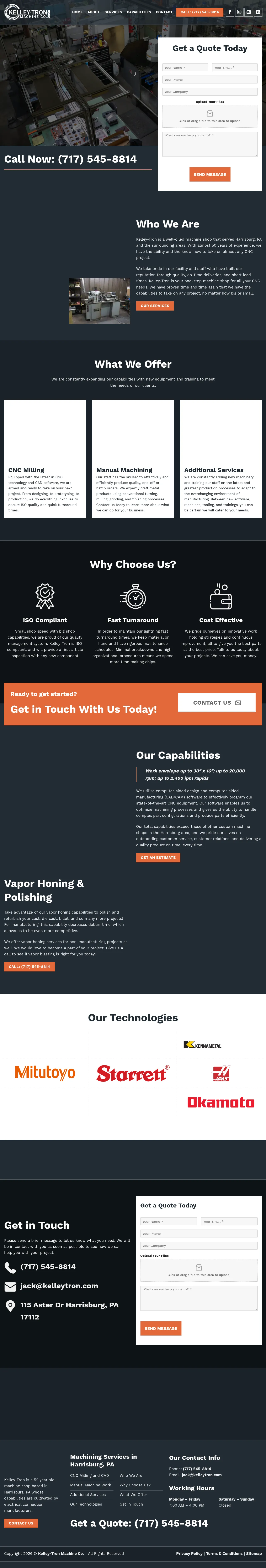 Kelley-Tron Machine Co. is a Pennsylvania-based machine shop providing comprehensive CNC machining and manual manufacturing services. With over 50 years of experience, the company specializes in precision machining, prototyping, and production services for a variety of industries. Their facility features advanced CNC equipment and CAD/CAM software to handle complex part geometries and diverse configurations. The company emphasizes quality management and efficient turnaround times, maintaining ISO-compliant internal processes. Additionally, they offer specialized surface finishing through vapor honing services to support both industrial and custom project requirements.
